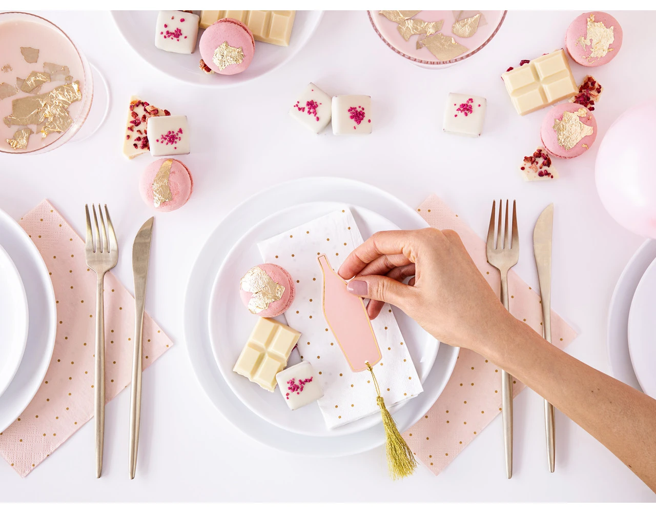 Inhoud: Plaats kaarten van papier in roze kleur met goud metallic print en gouden leeswijzer van de string, de grootte van de fles ca. 3,5 x 10 cm, de grootte van de fles met kwastje ong. 3,5 x 16 cm. (1 PKT / 6 st.)