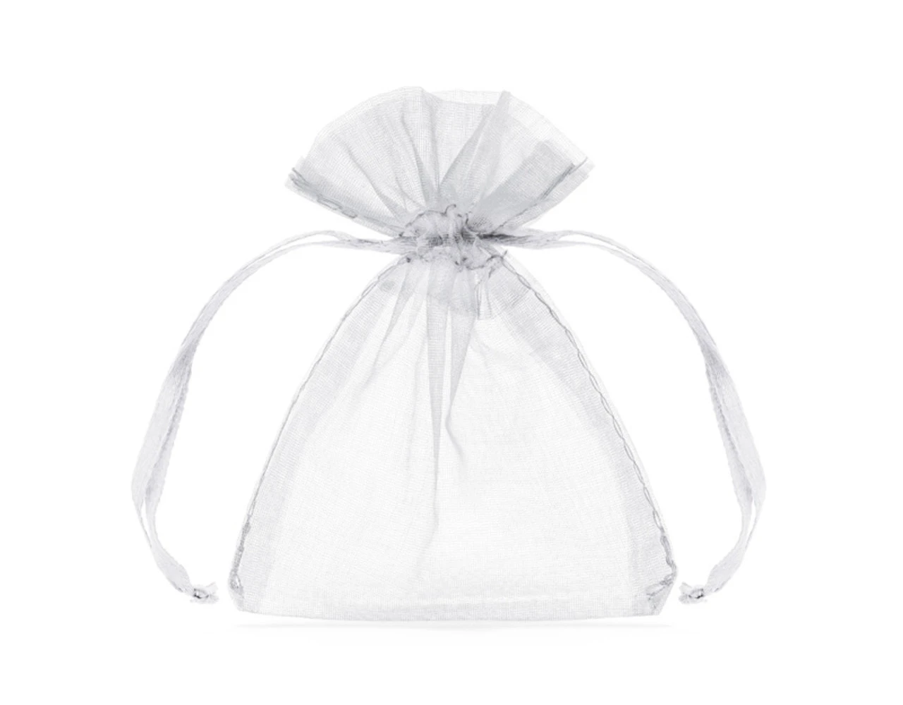 Trekkoordzakjes van effen organza in witte kleur, formaat ca. 7,5 x 10 cm. Ideaal als cadeautje voor bruiloftsgasten.