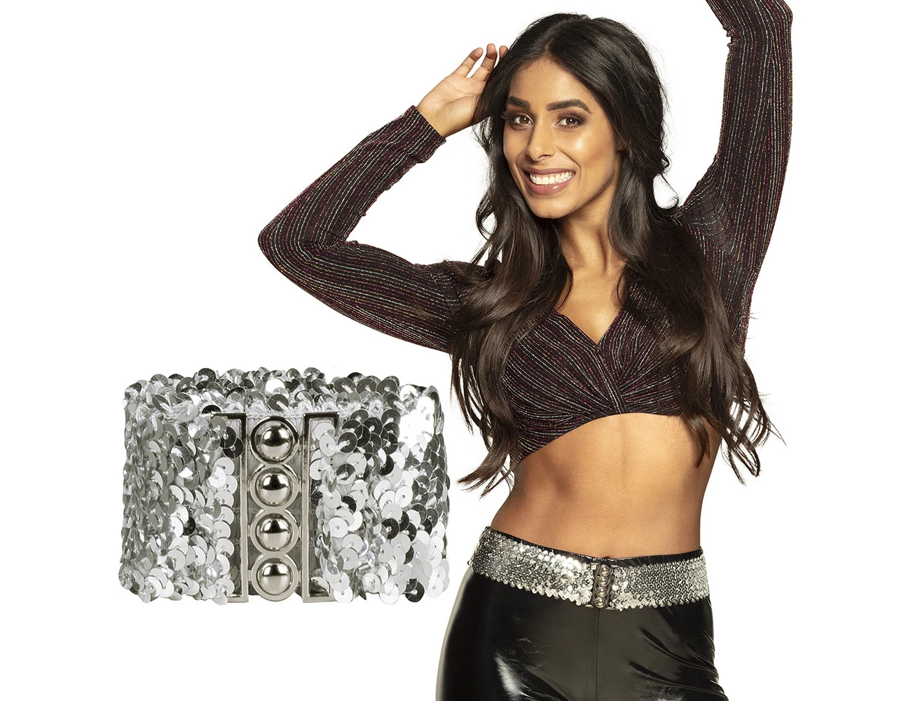 Verpakkingsinhoud: Riem Pailletten zilver 60-110 cm stretch x 5 cm