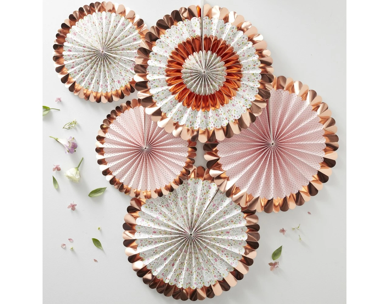 Deze roségouden feestdecoraties zijn eenvoudig op te hangen en zijn een geweldige manier om instant glamour in elke kamer te brengen. De waaiers hebben de kleurrijke Ditsy Floral-print en een pastelroze roségouden stippendessin. Afgewerkt met roségoudfolie zullen deze waaiers een prachtig middelpunt vormen.