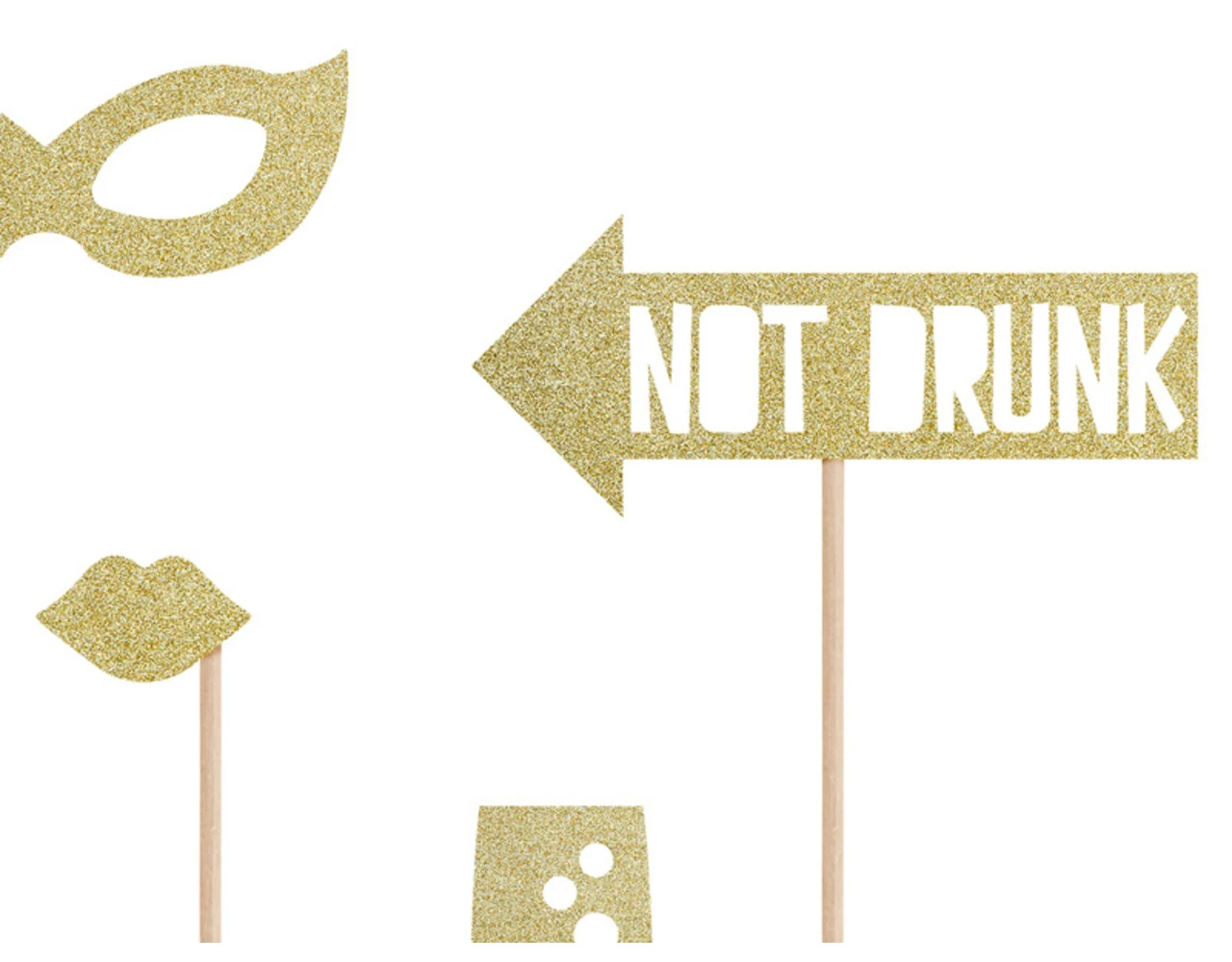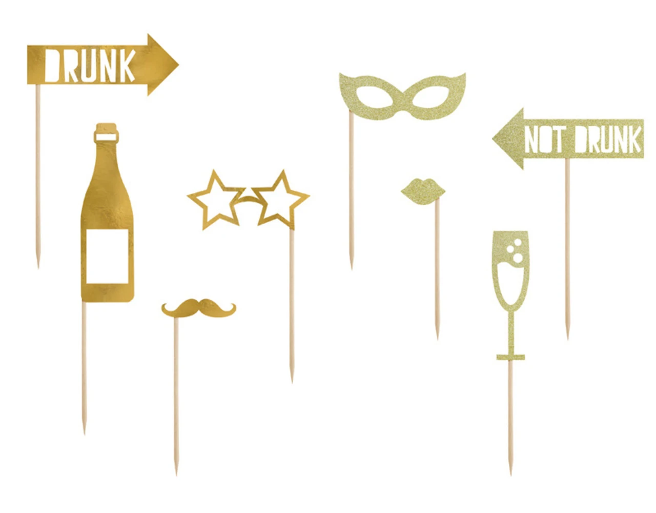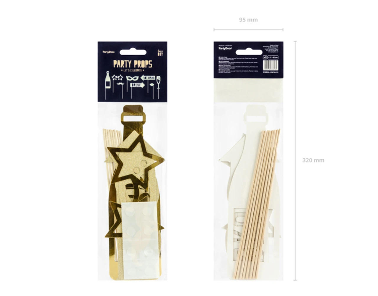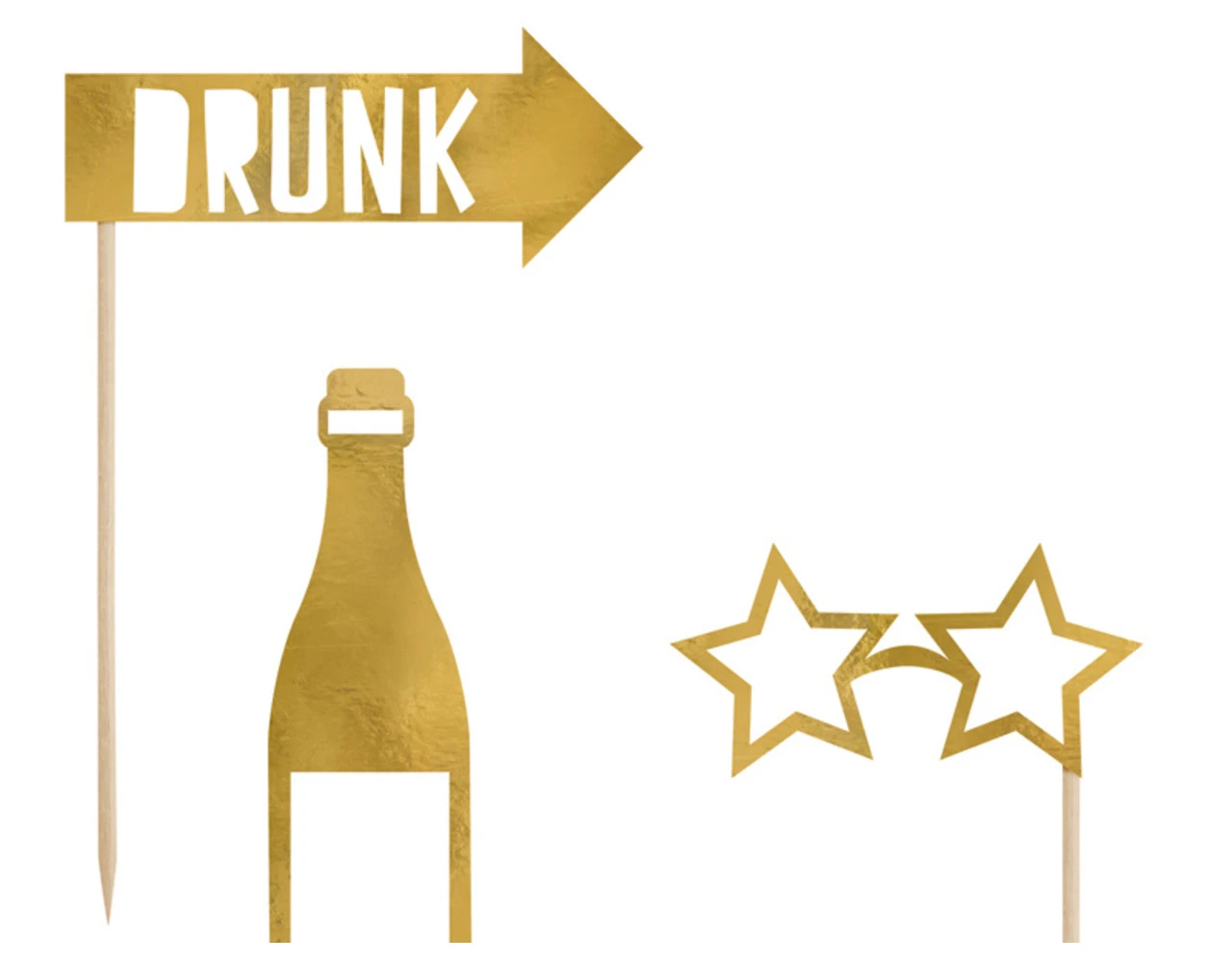 Fotoprops Let’s Celebrate in goudkleur, mix van motieven, doe-het-zelf product, hoogte na montage ca. 21 – 42 cm.