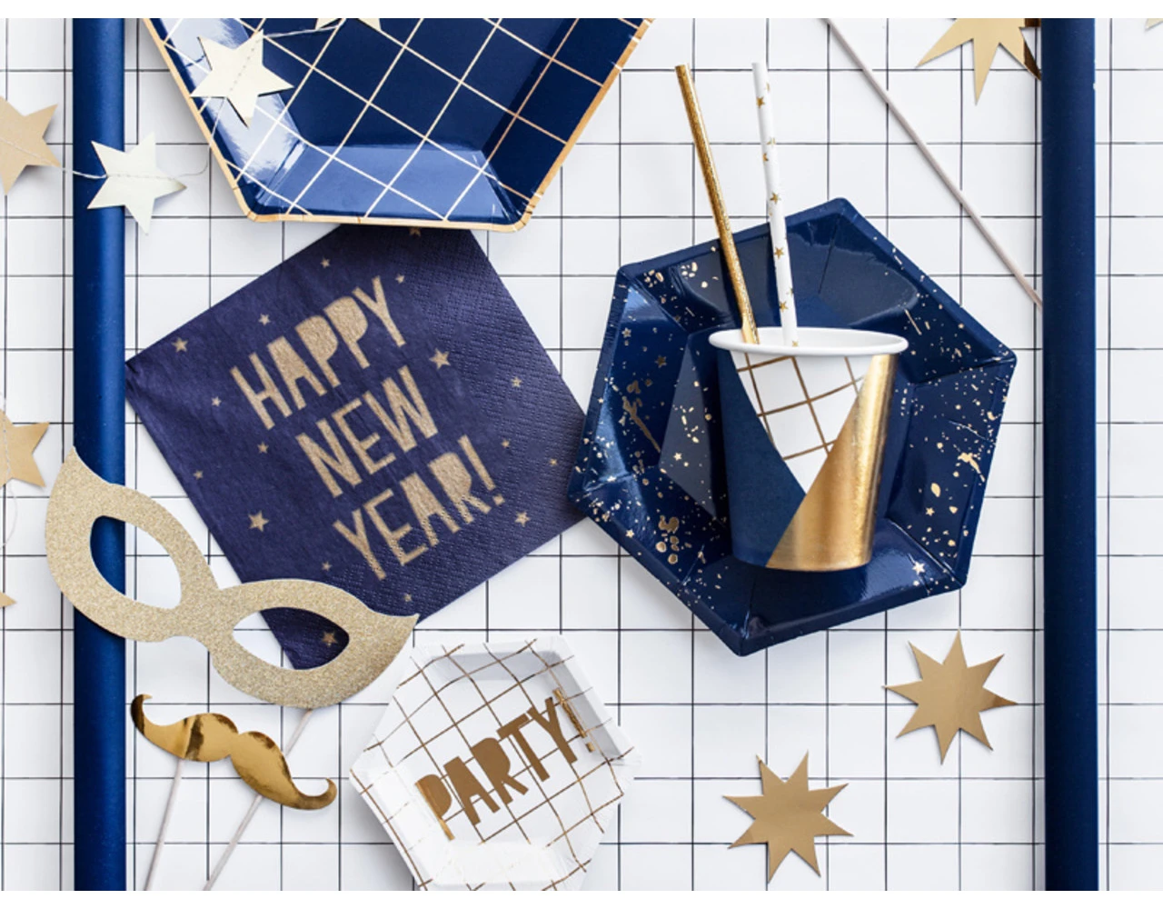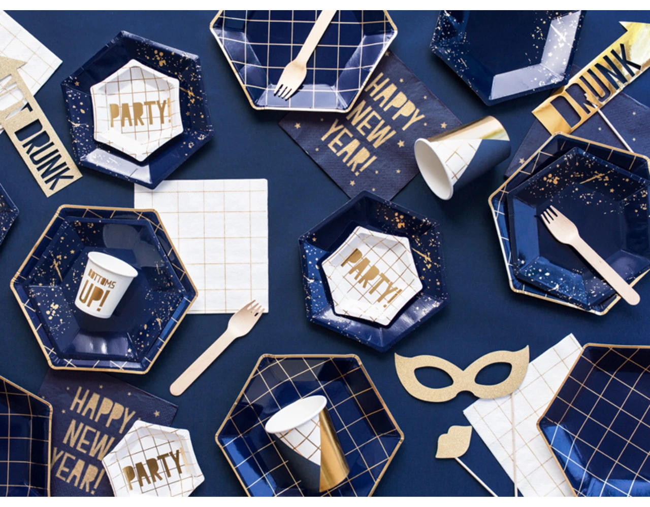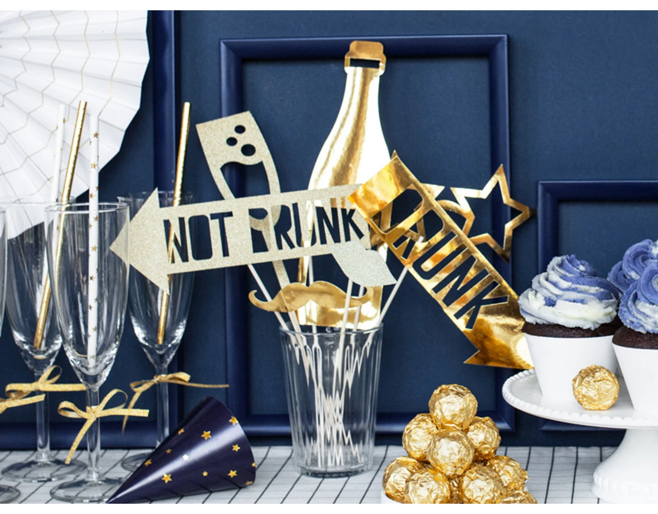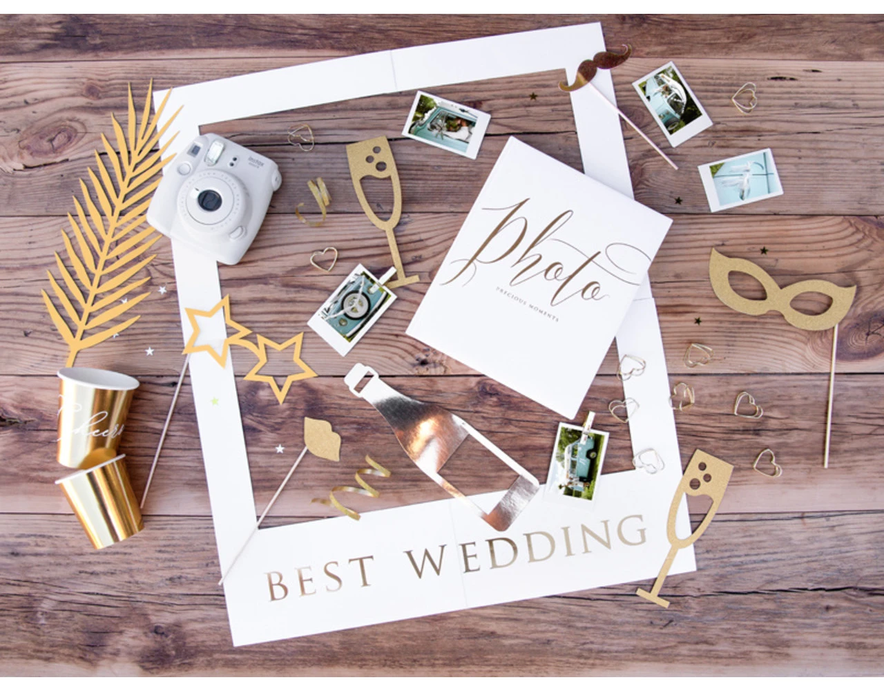 Fotoprops Let’s Celebrate in goudkleur, mix van motieven, doe-het-zelf product, hoogte na montage ca. 21 – 42 cm.