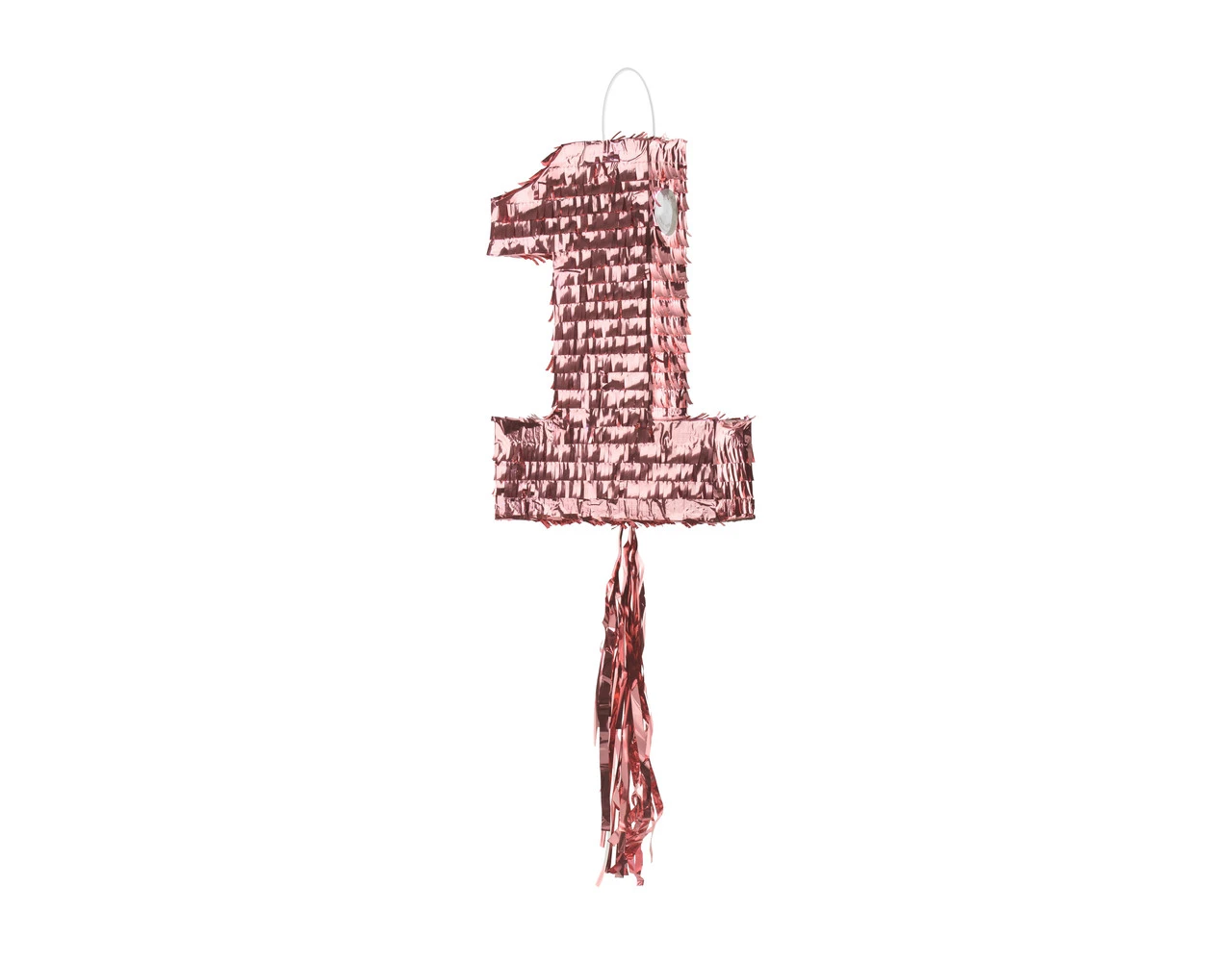 Inhoud: Pinata in de vorm van nummer 1 in rose goud kleur, tot ca. vullen met goodies, grootte. 28,5 x 40,5 x 8 cm.
