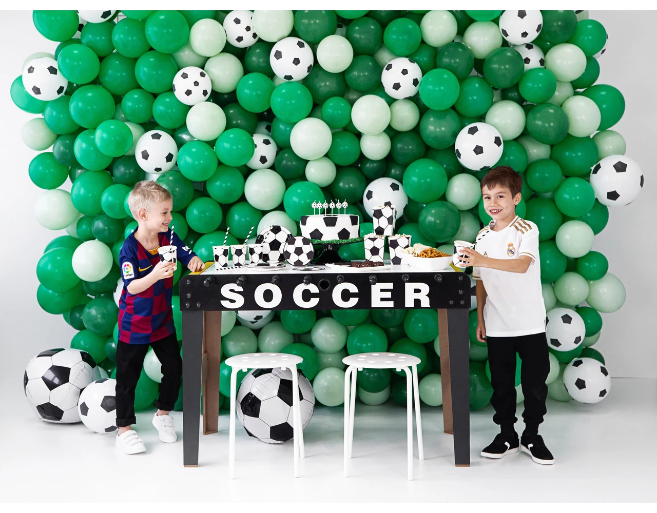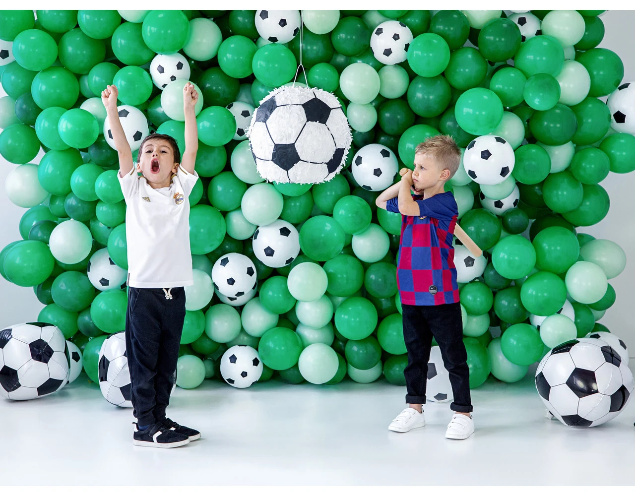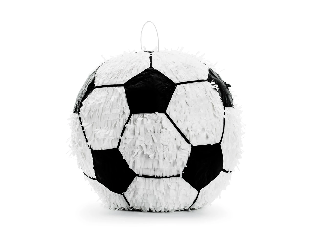 Inhoud: Pinata in de vorm van het voetbal in de kleur wit met zwarte elementen, tot ca. vullen met goodies, grootte. 35 x 35 x 35 cm.