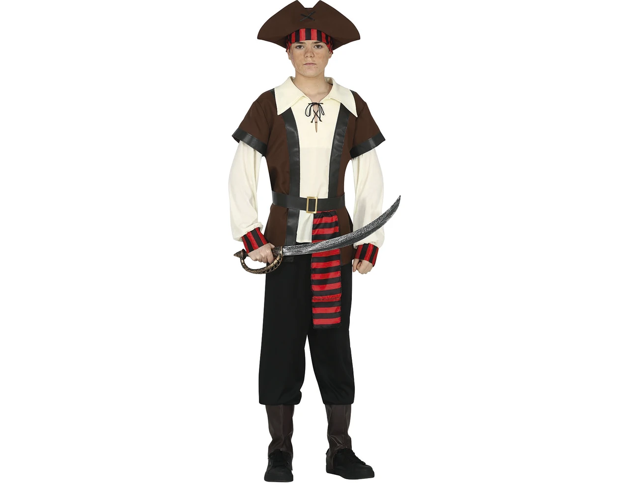 Inhoud: hoed, hoofdband, hemd, vest, riem, broek, laarzen