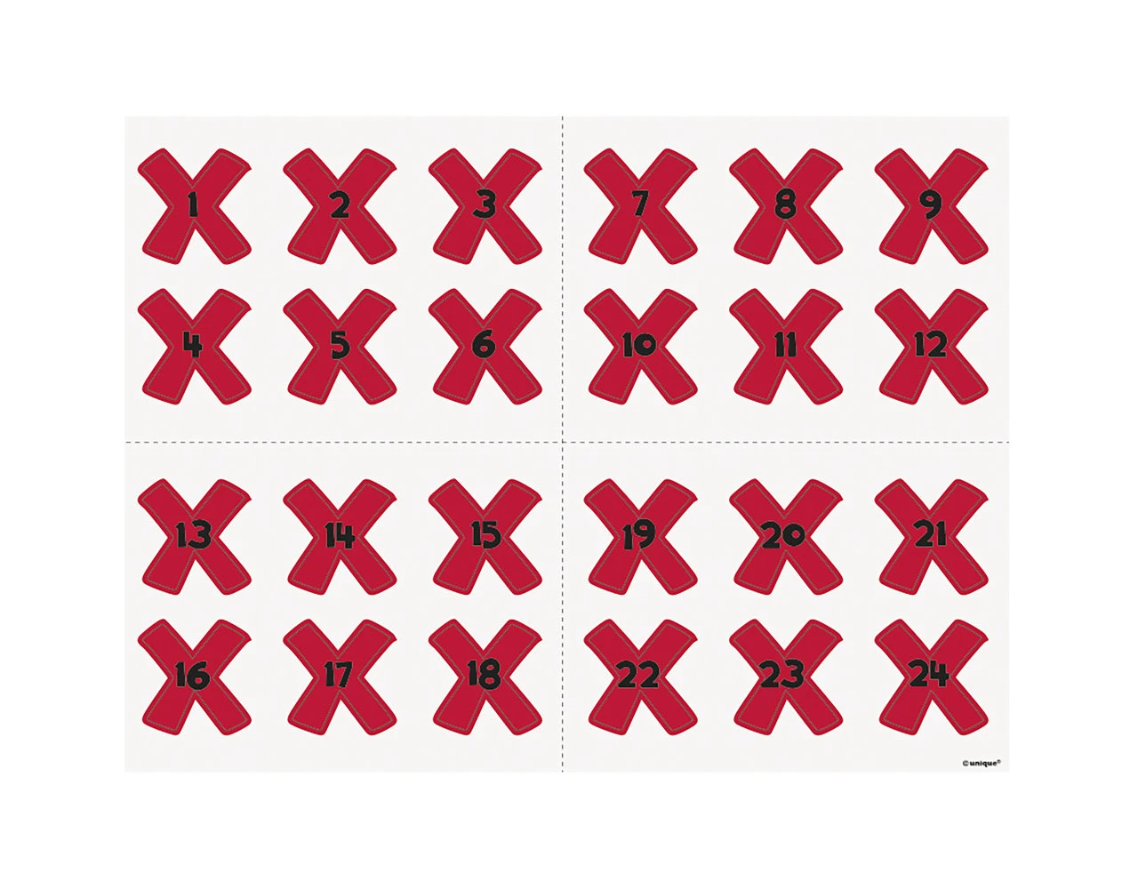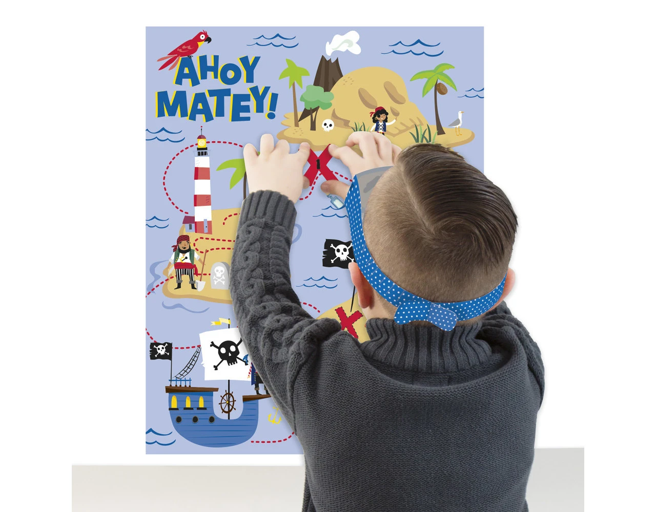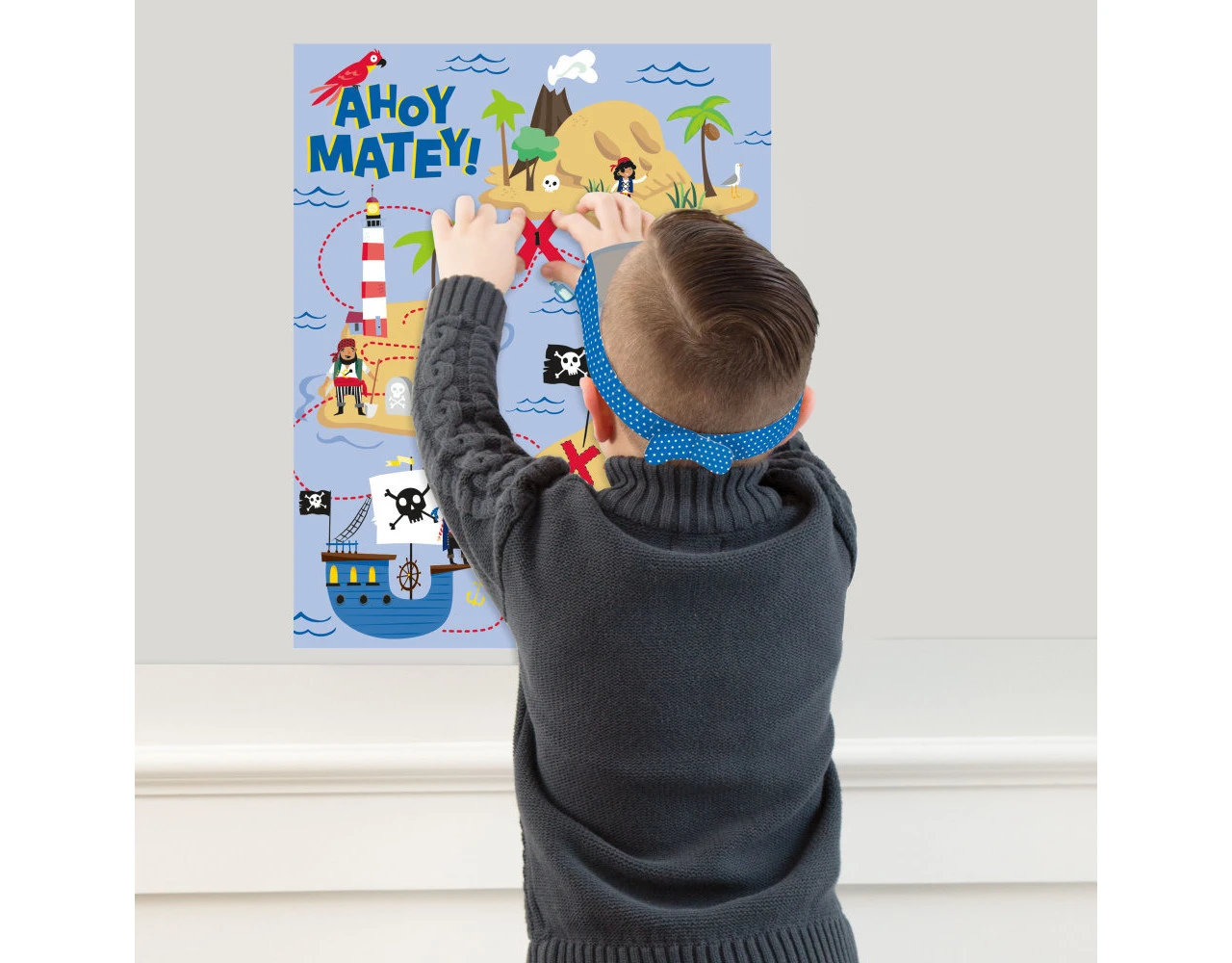 Inhoud: vel voor aan de muur, blinddoek en 24 stickers