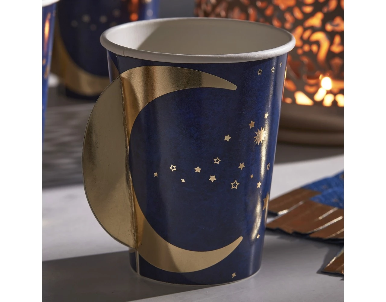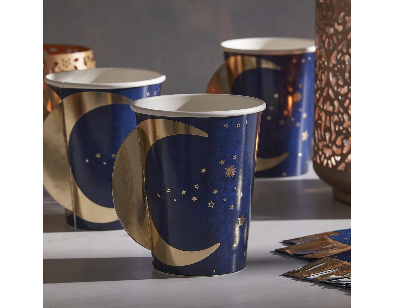 Vier Eid dit jaar in stijl met onze prachtige Eid-bekers, met een uitspringende halve maan en sterren, met een luxueus marineblauw en goud kleurenschema – de perfecte aanvulling op je Eid-decoraties!