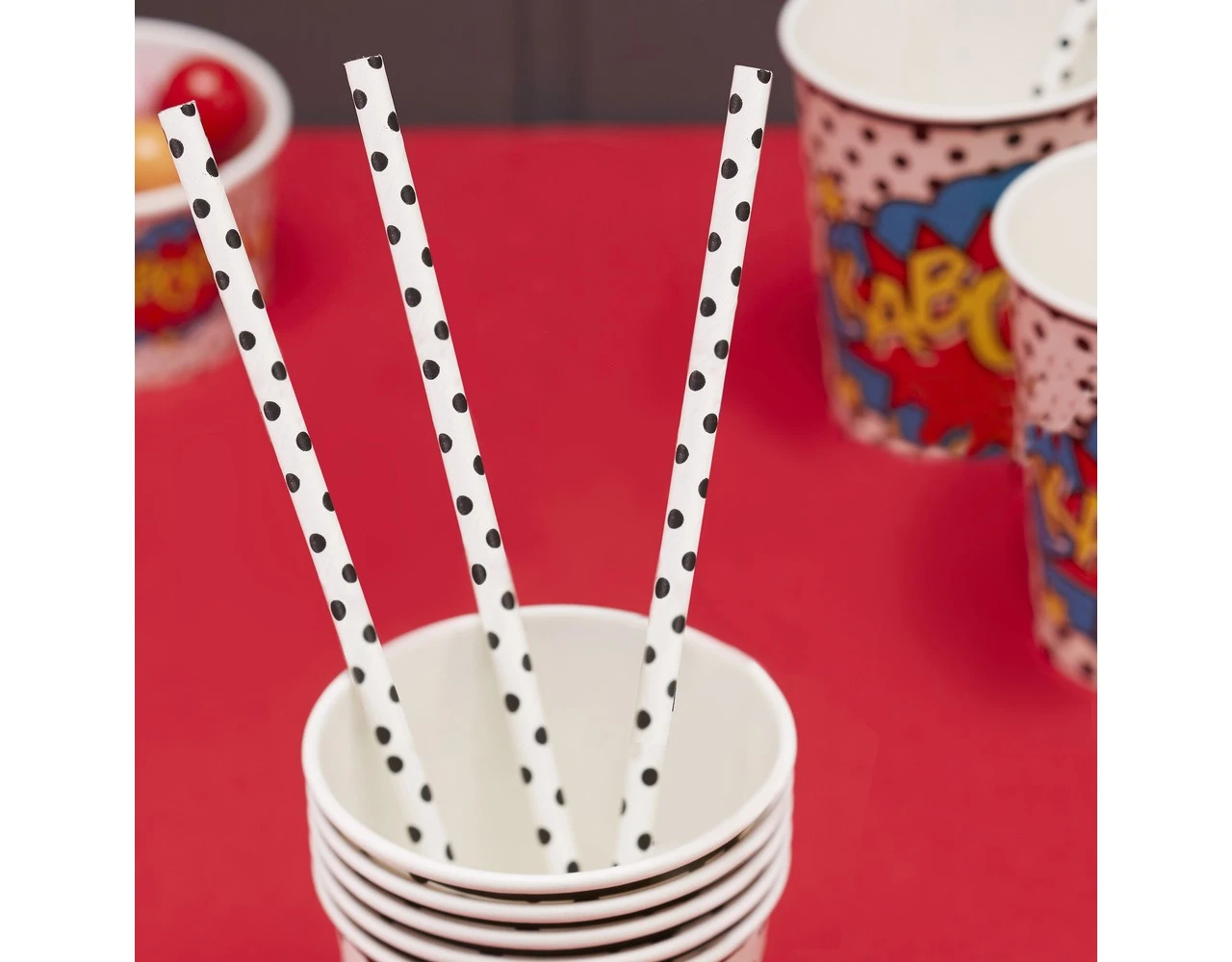 Deze prachtige papieren rietjes met witte en zwarte stippen zijn onmisbaar op je verjaardagsfeestje voor striphelden. Ga door, voeg wat plezier toe aan je drankjes!