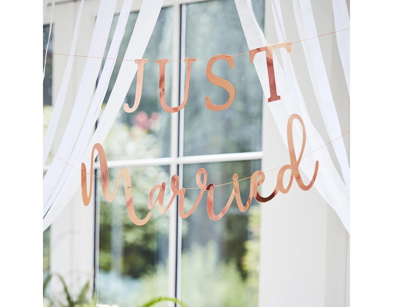 Deze prachtige roségouden Just Married-huwelijksbanner is de perfecte decoratie voor je trouwdag! Het verbluffende scriptlettertype ziet er prachtig uit op alle trouwlocaties en zal zeker geliefd zijn bij iedereen.