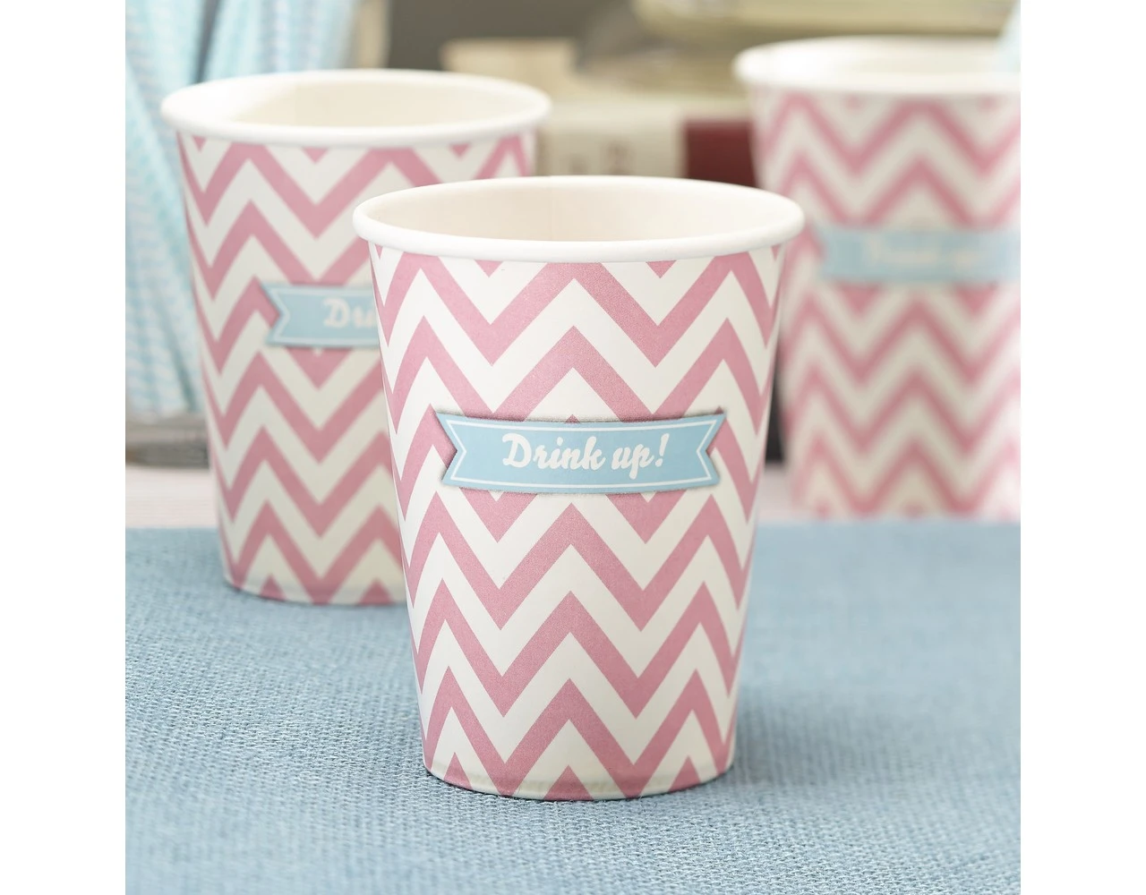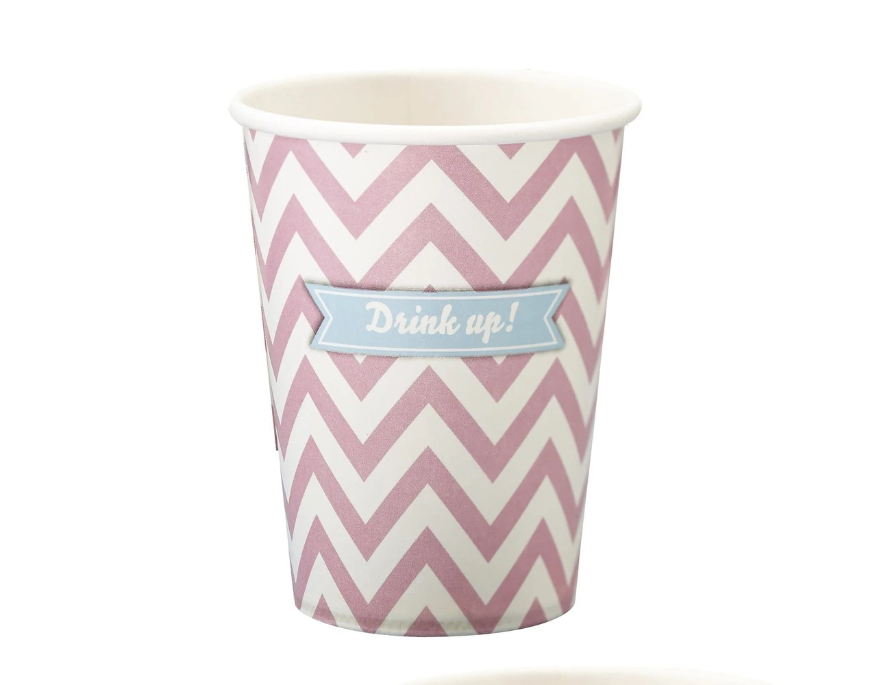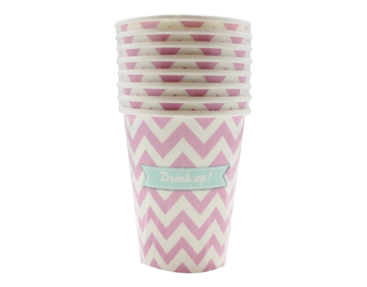 Deze opvallende papieren bekers zijn perfect voor je volgende feestje! In roze pastel chevron met de woorden ‘Drink Up’. Pak van 8.