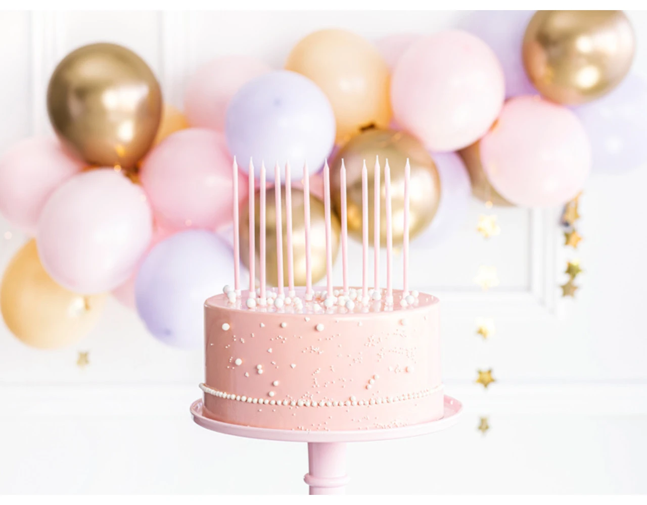 Effen verjaardagskaarsjes in lichtroze kleur, hoogte ca. 14 cm. Set bevat 12 kaarsen en houders.
