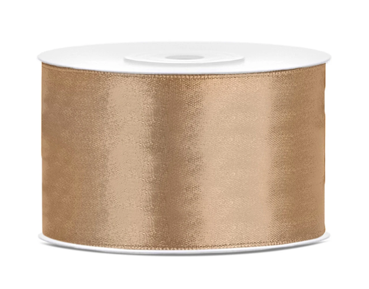 Inhoud: Satijn lint, licht goud, breedte 38 mm, lengte 25 m. (1 st. / 25 lm)