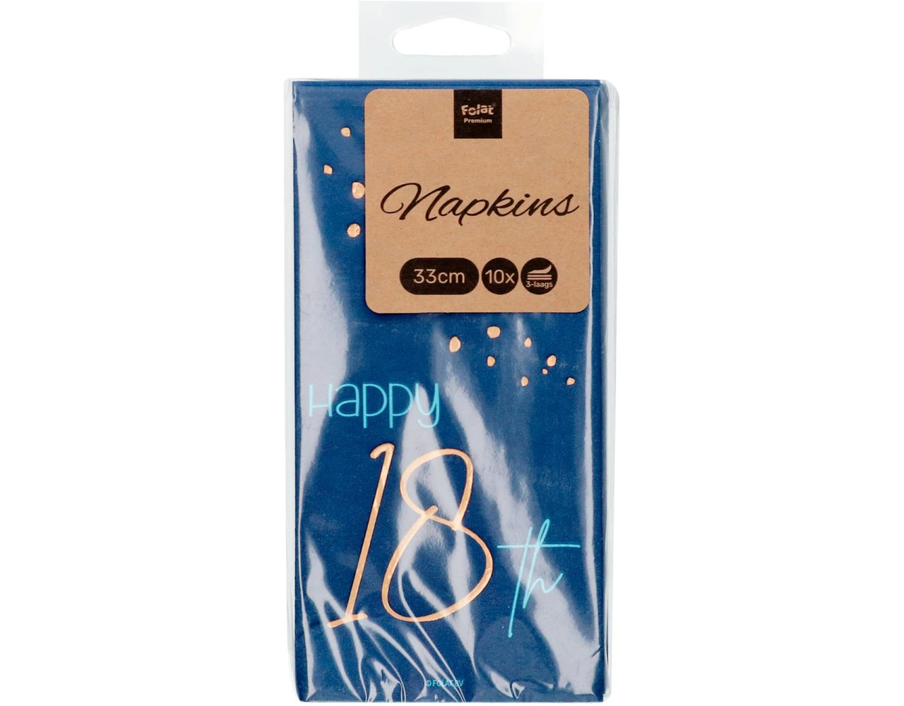 Servetten Elegant True Blue 18 Jaar 33x33cm – 10 stuks. Inhoud: 10 servetten van 33x33cm. Kleur: Blauw. Bijvoorbeeld te gebruiken tijdens de volgende feestgelegenheid/feestgelegenheden: Verjaardag, Jubileum. Een servet is 33x33cm groot. Het artikel is gemaakt van papier.Â