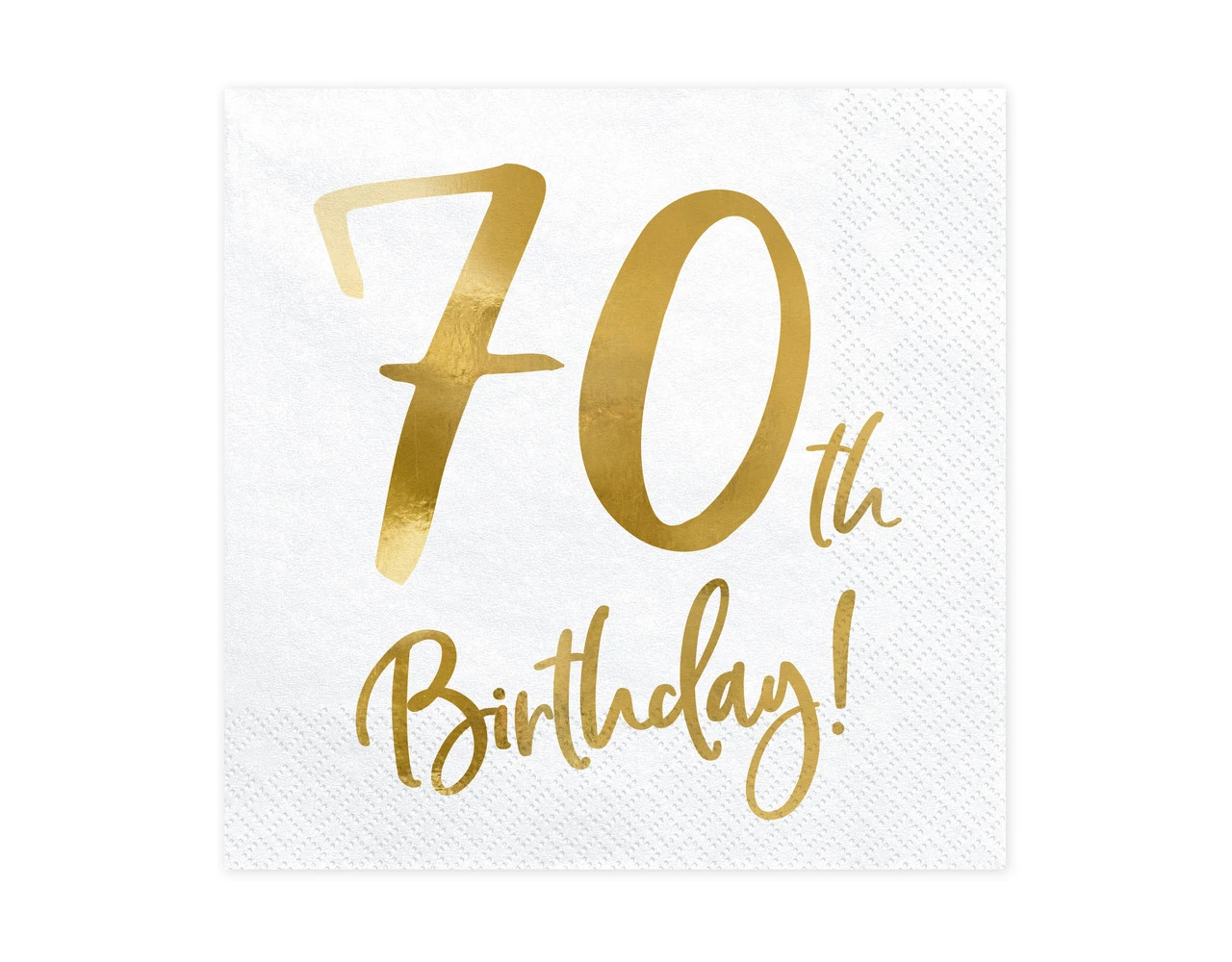 Inhoud: Papieren servetten 70ste verjaardag, wit met gouden inscriptie, de grootte na het uitklappen van ca.. 33 x 33 cm, grootte na montage ca. 16.5 x 16.5 cm.