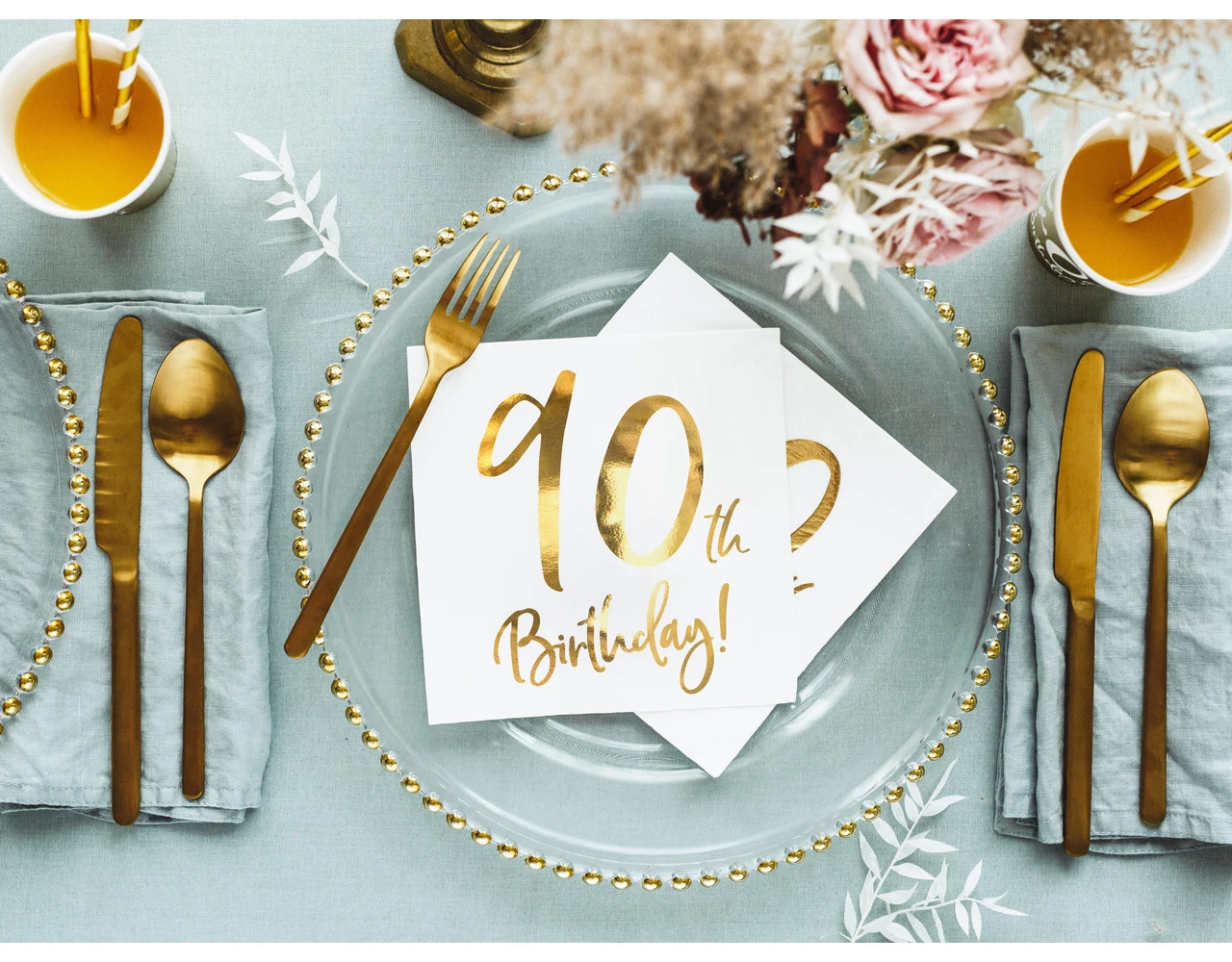Inhoud: Papieren servetten in de kleur wit met gouden metallic inscriptie 90ste Verjaardag, de grootte na het uitklappen van ca.. 33 x 33 cm, grootte na montage ca. 16.5 x 16.5 cm.