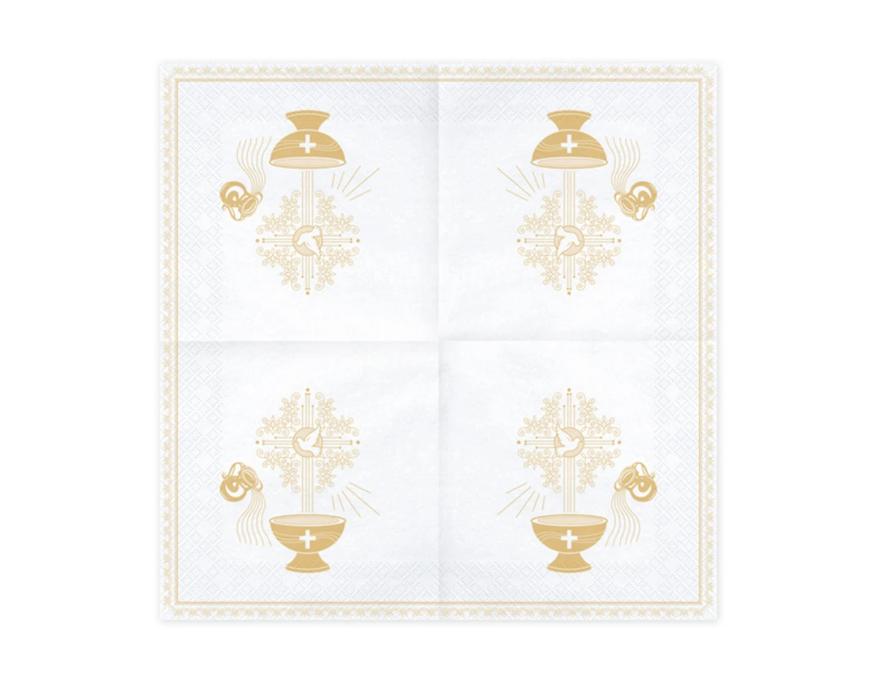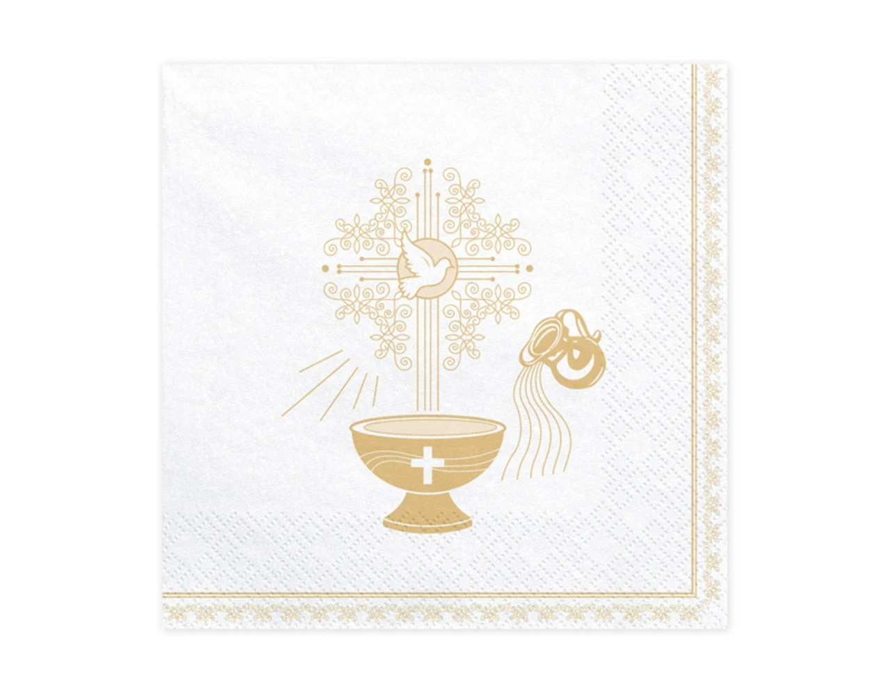 Papieren servetten Heilige Doop, wit met goud en roze opdruk, afmeting na uitvouwen ca. 33 x 33 cm, afmeting na samenvoegen ca. 16,5 x 16,5 cm.