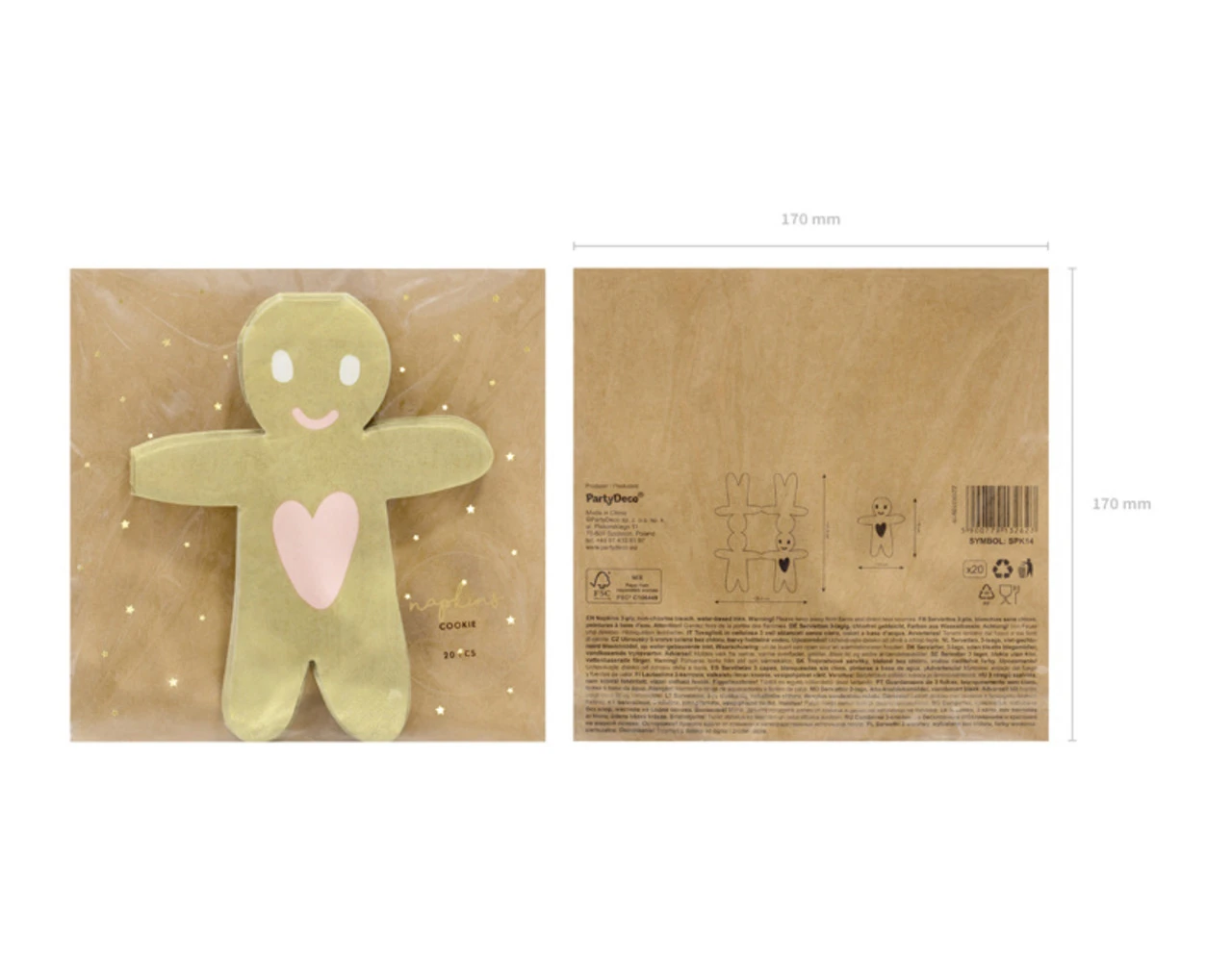 Papieren servetten Gingerbread Man, mix van kleuren, formaat na uitvouwen ca. 31,5 x 25,5 cm, formaat na in elkaar zetten ca. 16 x 13 cm.