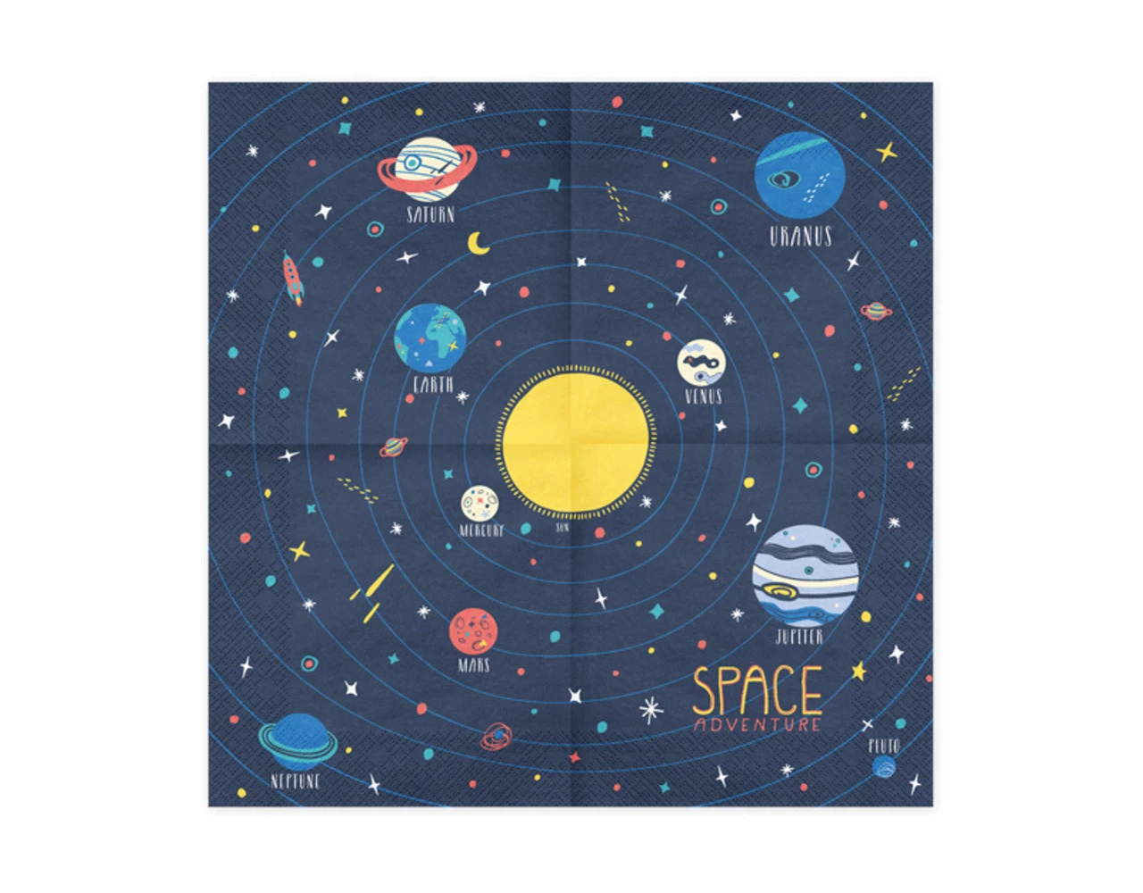 Papieren servetten Space Party, marineblauw met print, afmeting na uitvouwen ca. 33 x 33 cm, afmeting na samenvoegen ca. 16,5 x 16,5 cm.