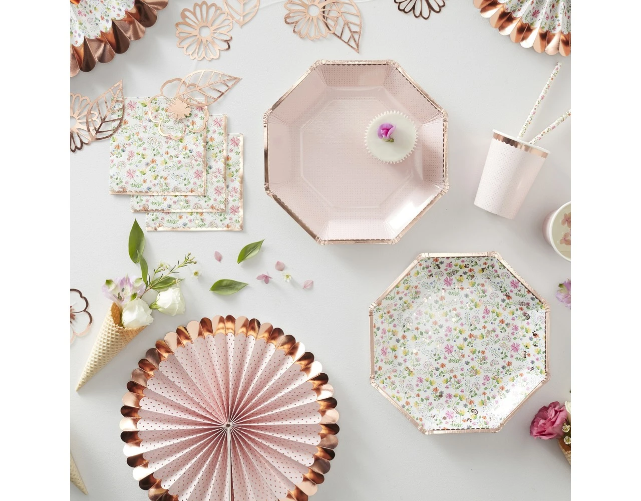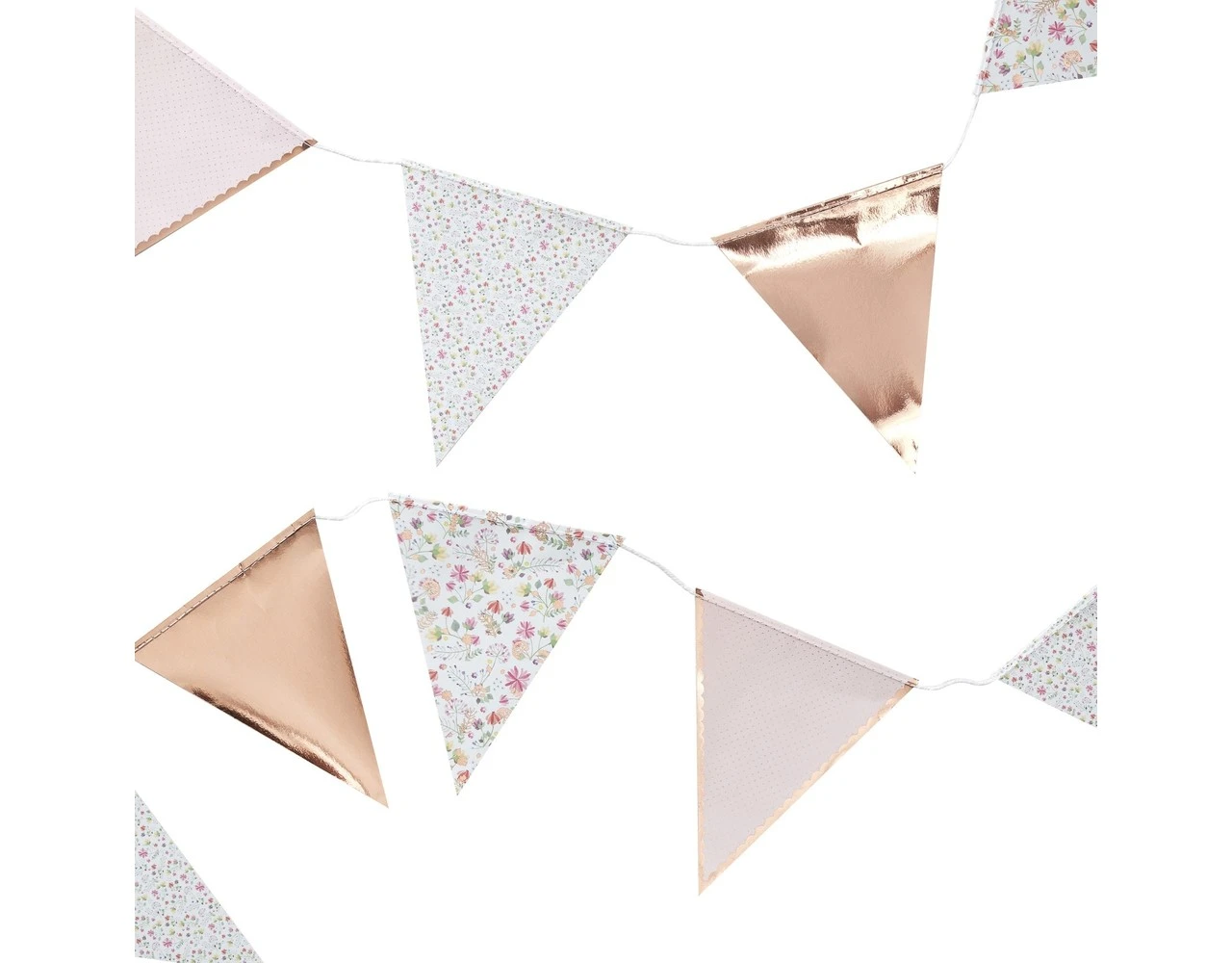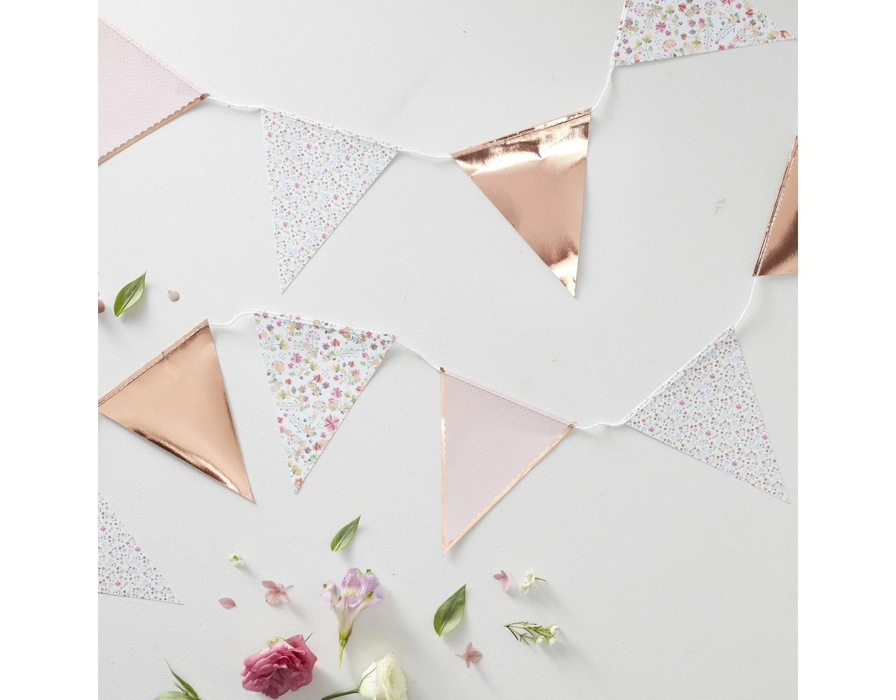 Deze prachtige bloemenslinger is perfect voor al je lente- en zomerfeesten! De roségouden slingervlaggen voegen een vleugje sprankeling toe aan deze schattige decoratie.