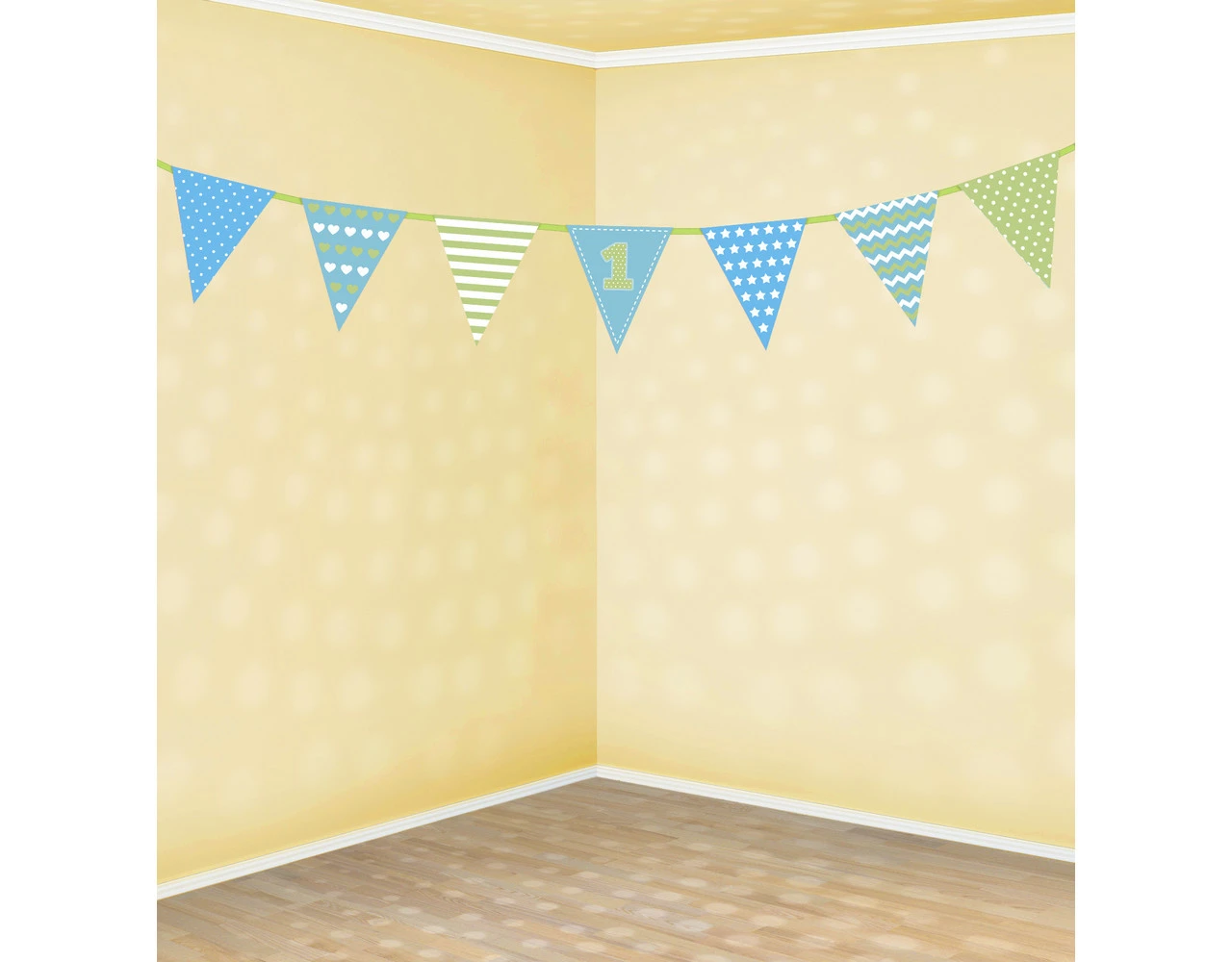 Inhoud: Eerst verjaardag Paper Garland, hemelsblauw en lichtgroen, afmetingen 18 x 135 cm.