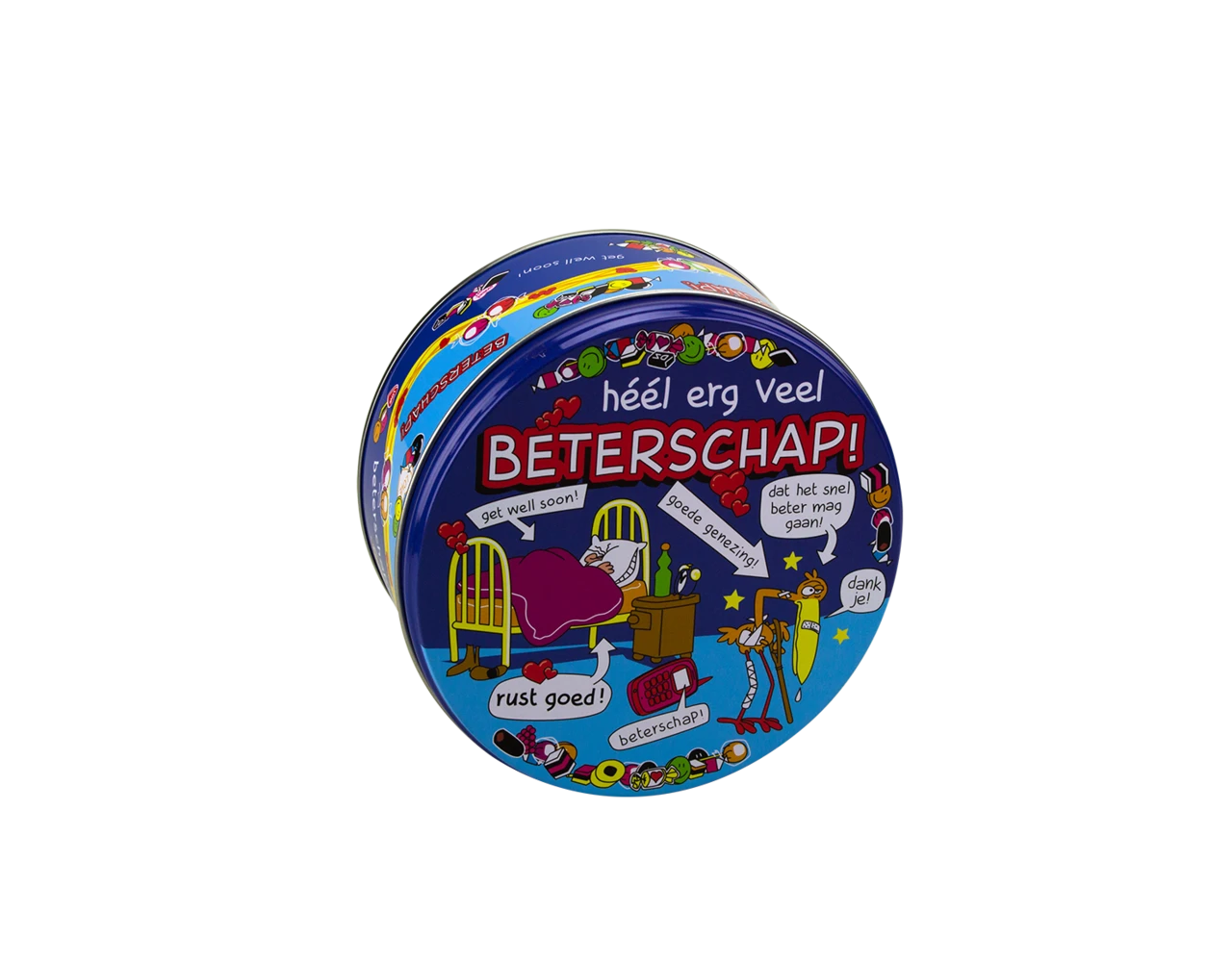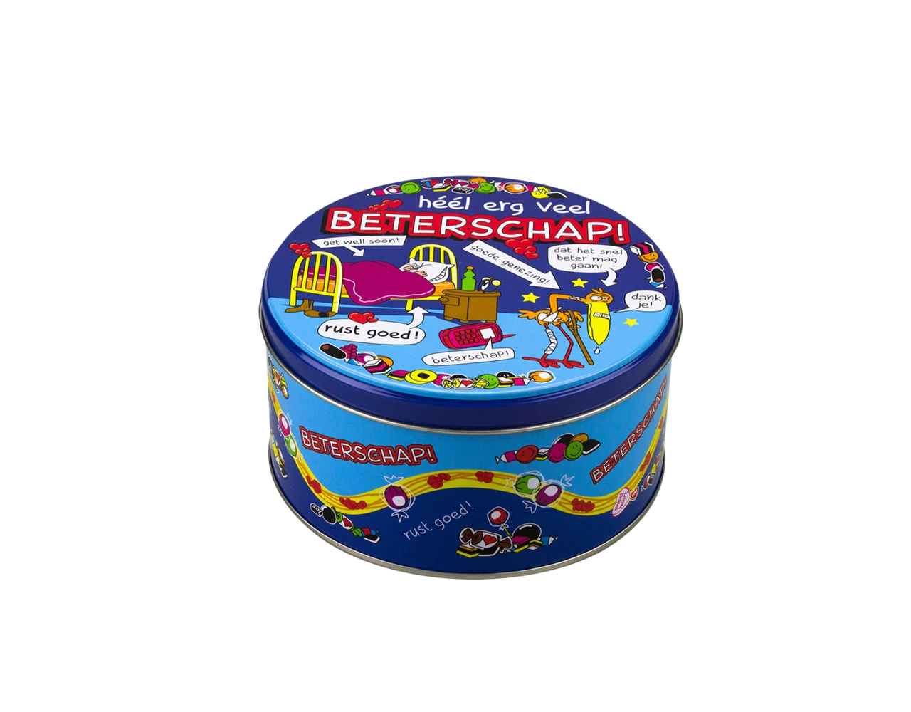 Verpakkingsinhoud: Snoeptrommel Beterschap 14cm