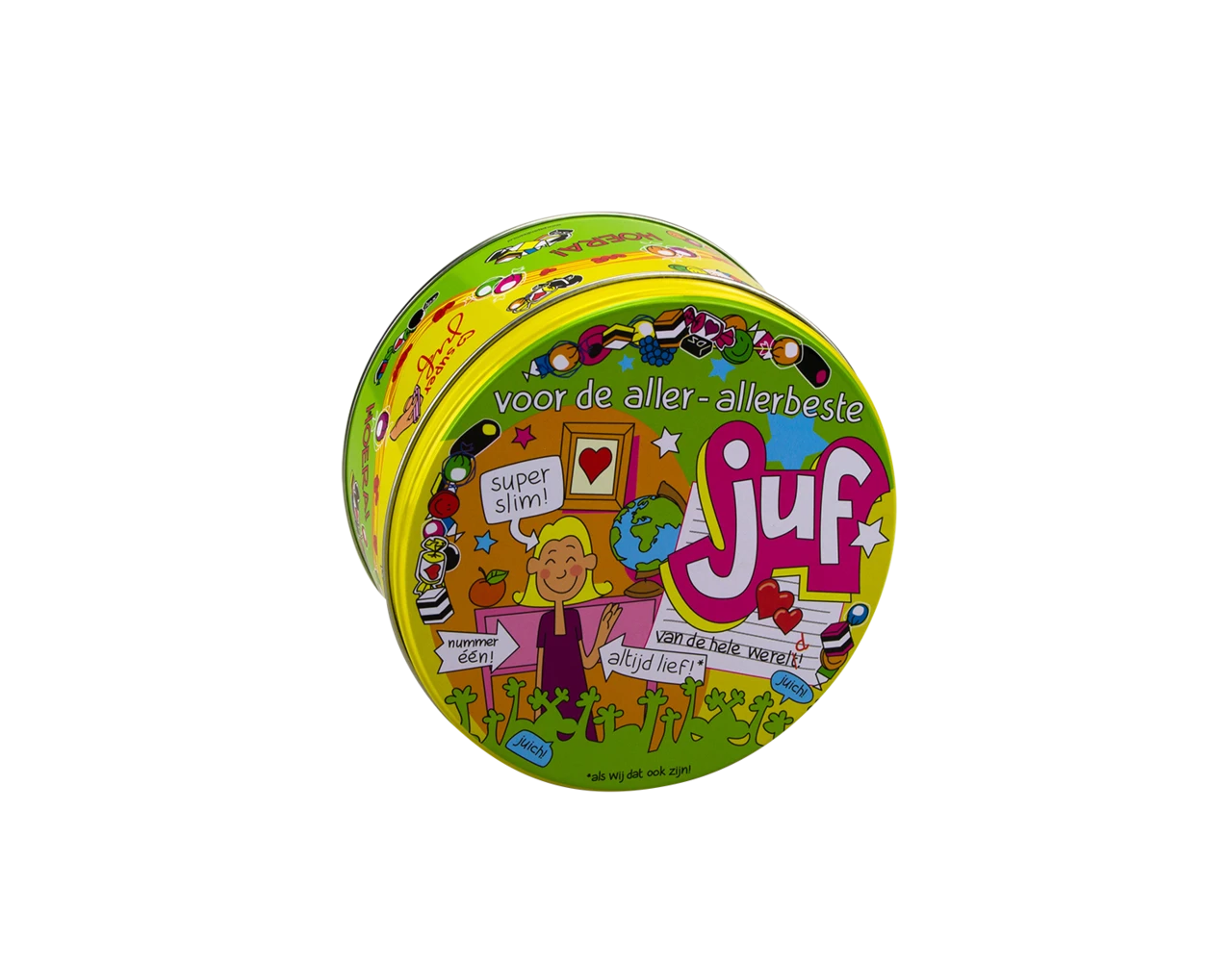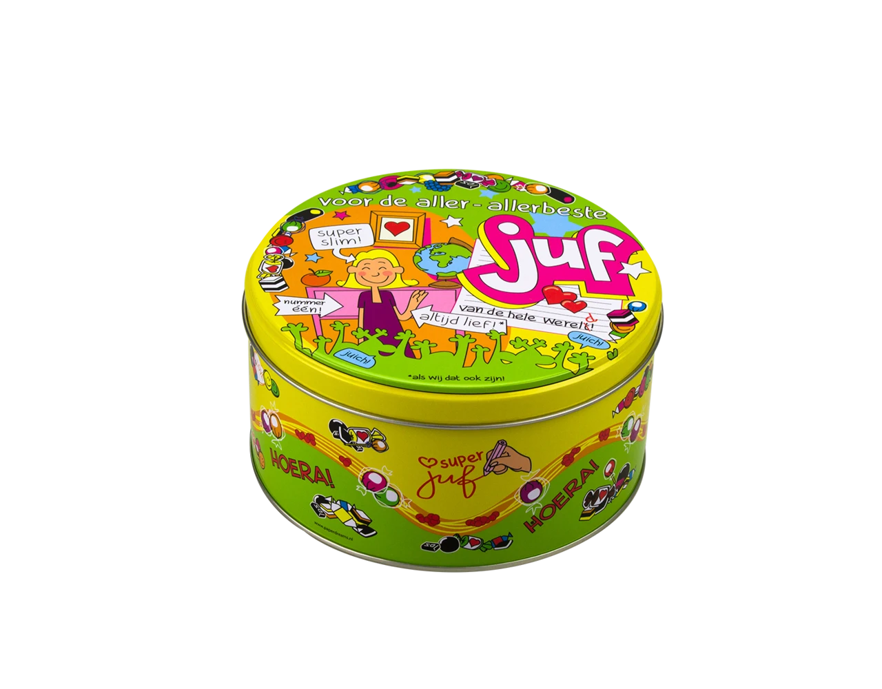 Verpakkingsinhoud: Snoeptrommel Juf 14cm