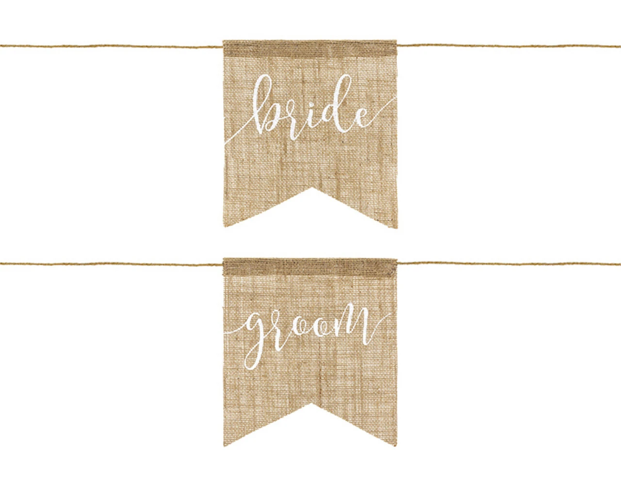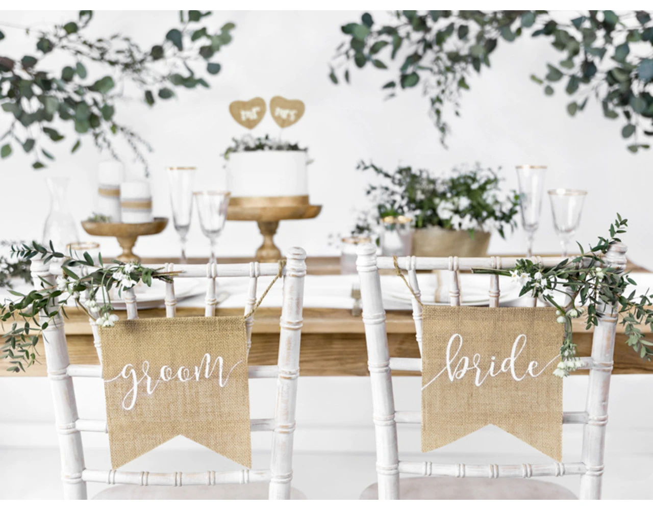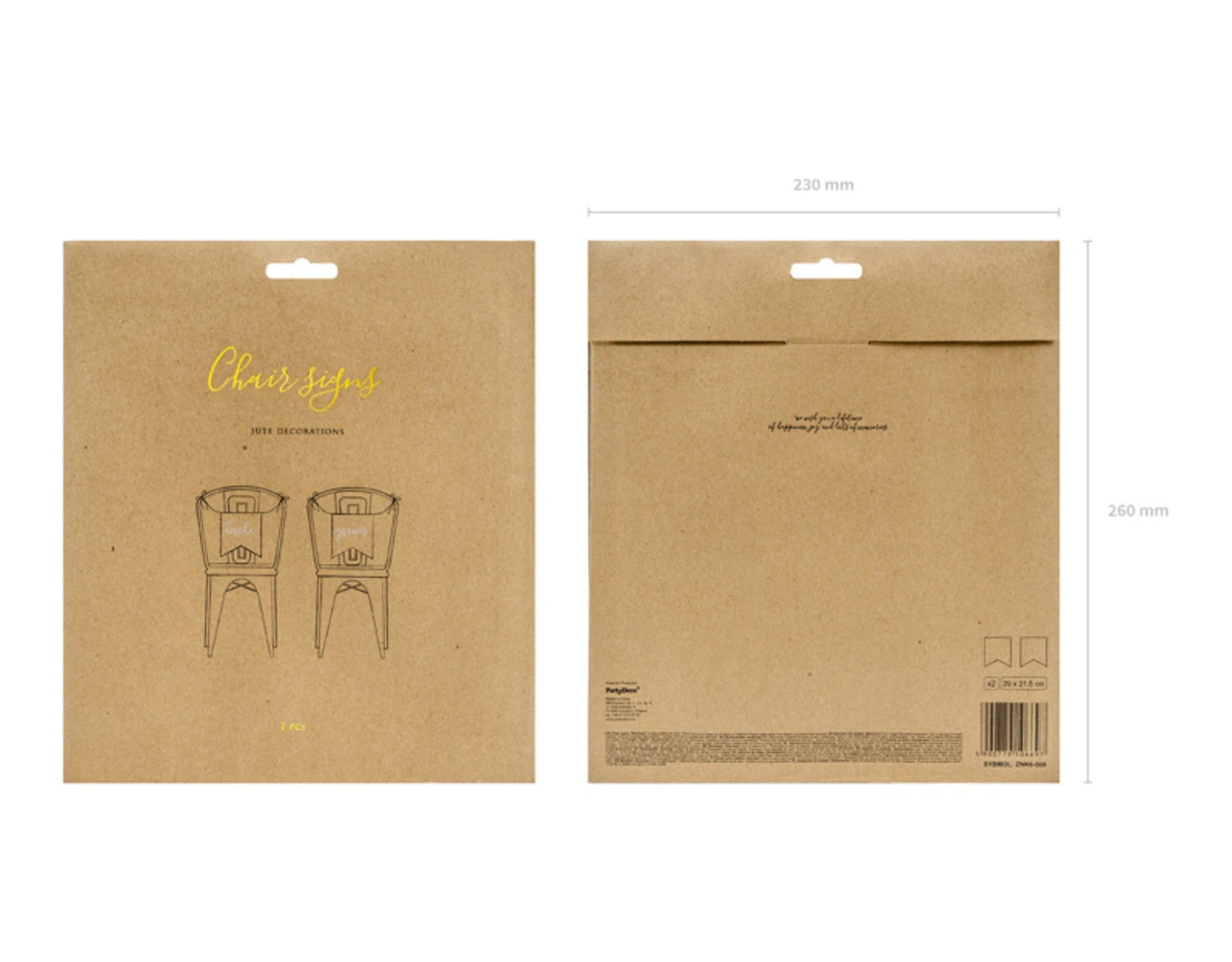 Stoelbordjes van jute, met wit opschrift Bruid en Bruidegom, afmeting ca. 20 x 22 cm.