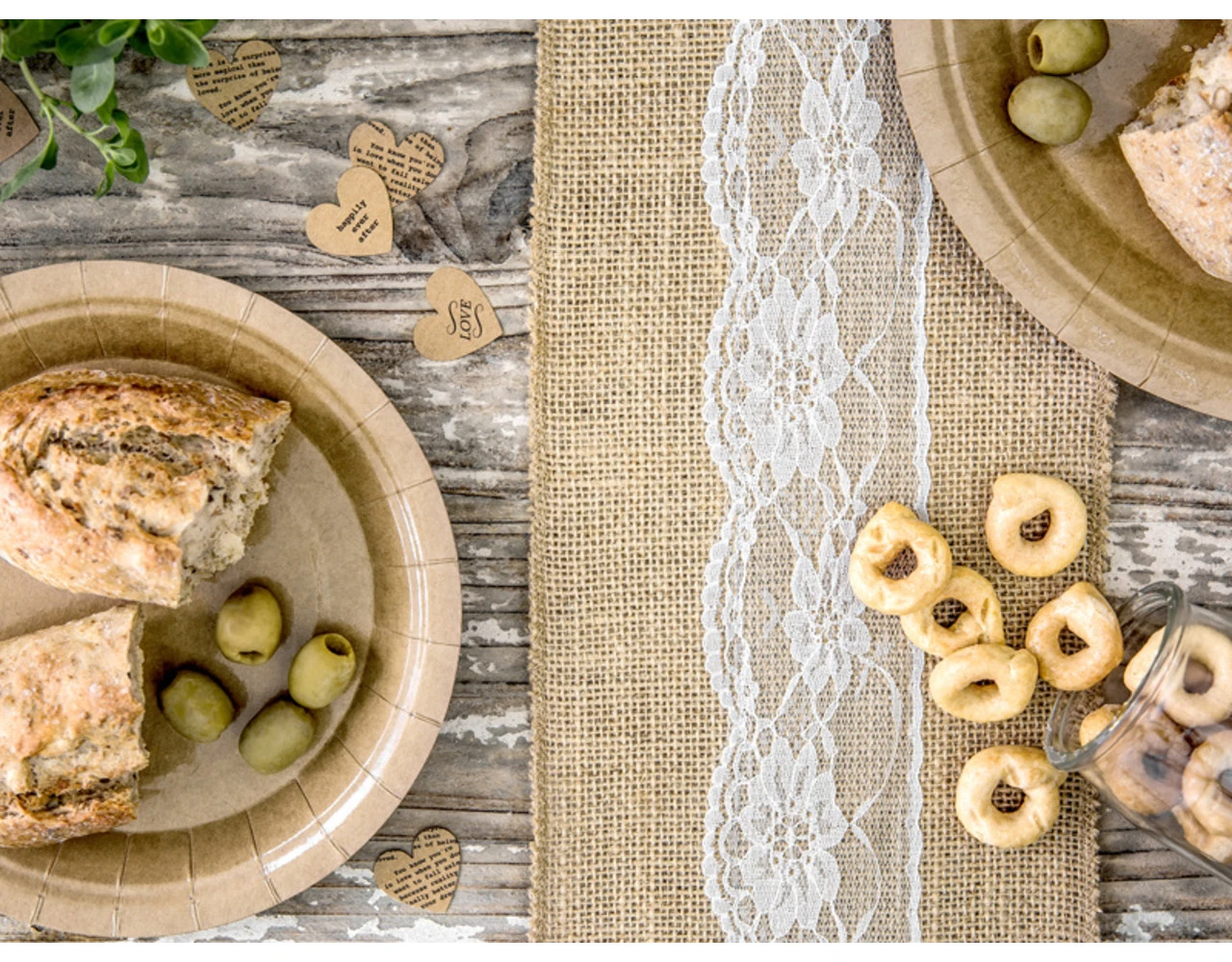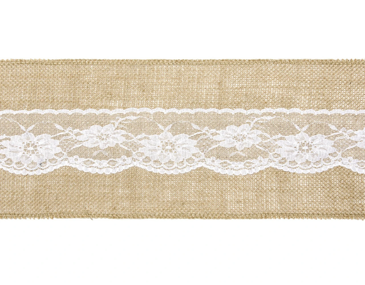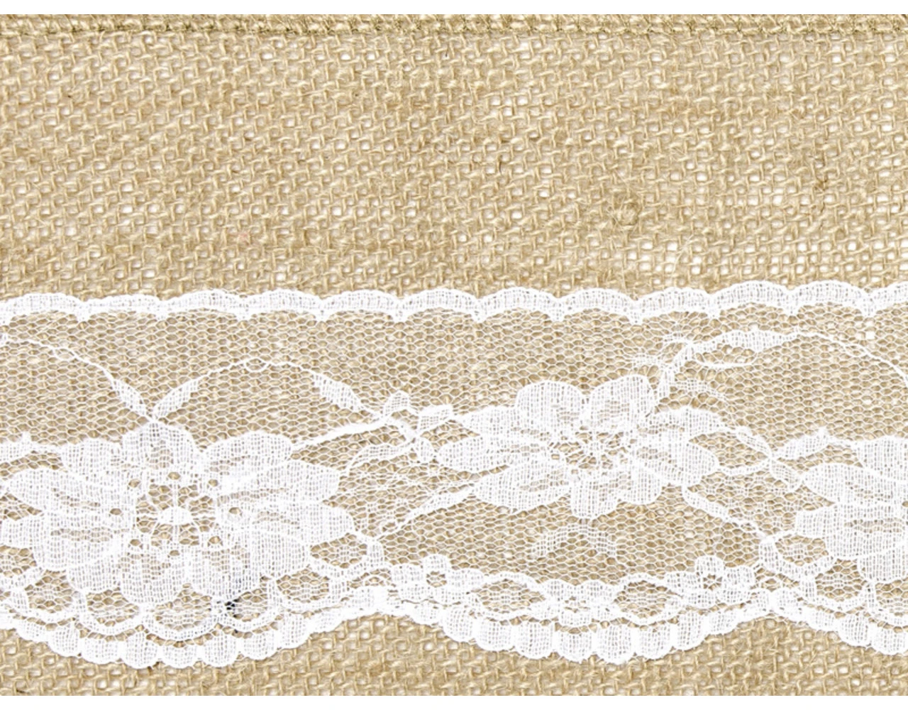 Burlap stoel sjerp met kant, breedte ca. 15 cm, lengte ca. 2,75 m.
