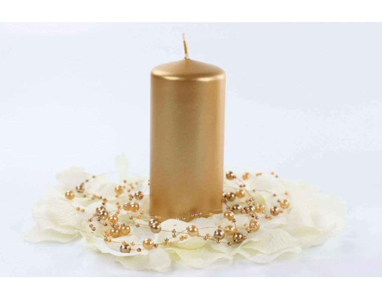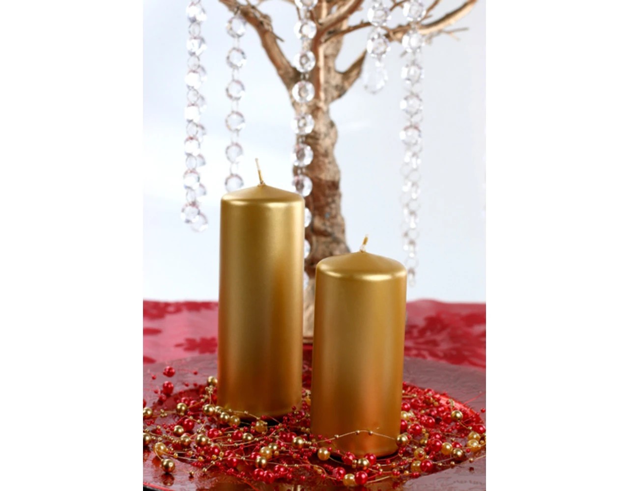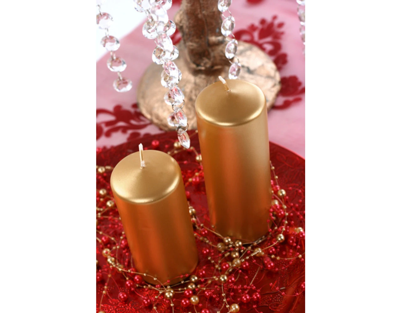 Zuilkaars, metallic, goud, hoogte 12 centimeter, diameter 6 centimeter. Brandduur van 1 stuk ca. 20 uur.