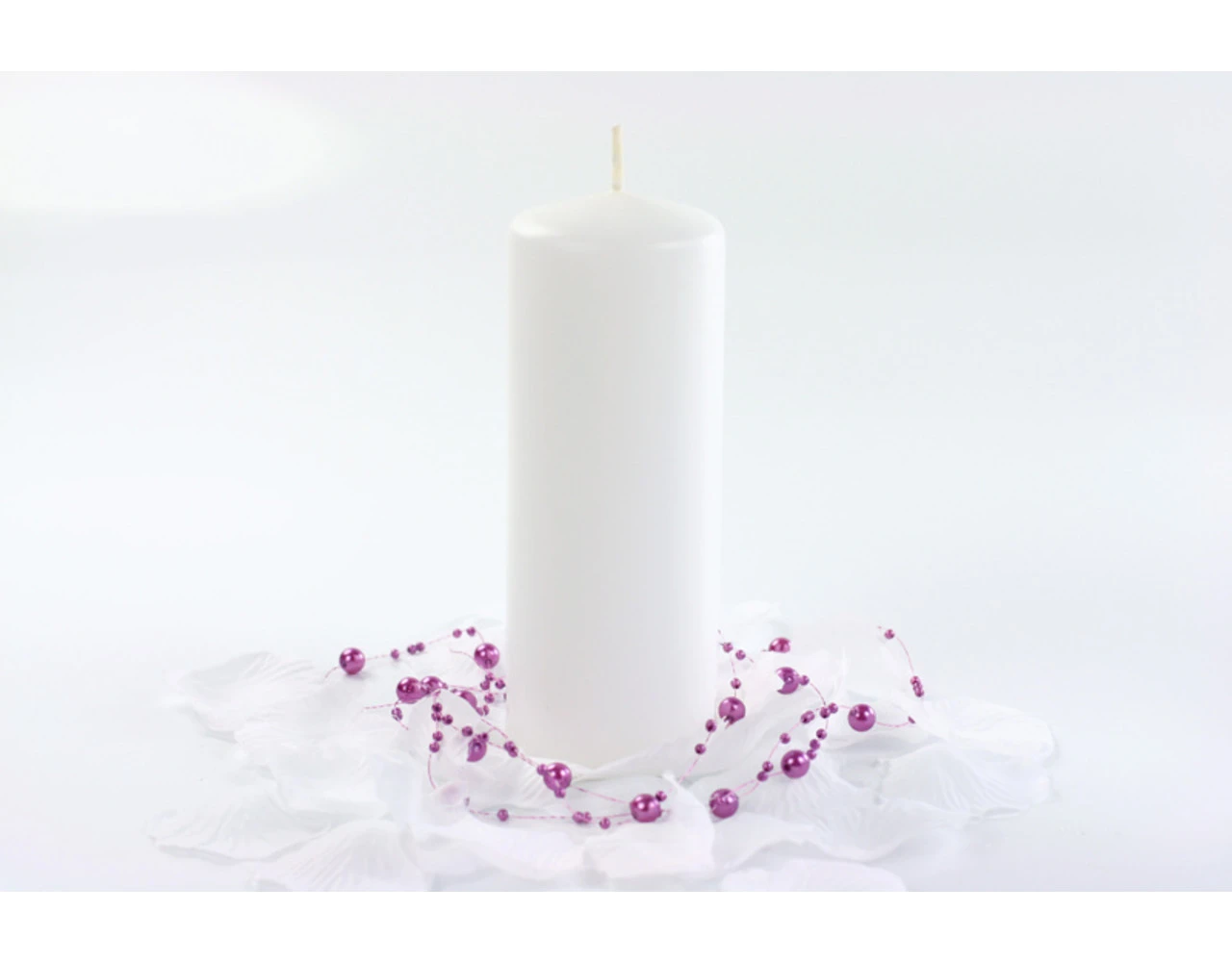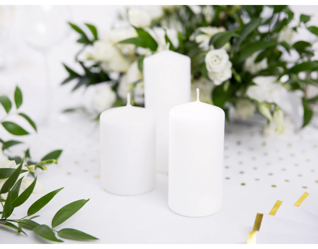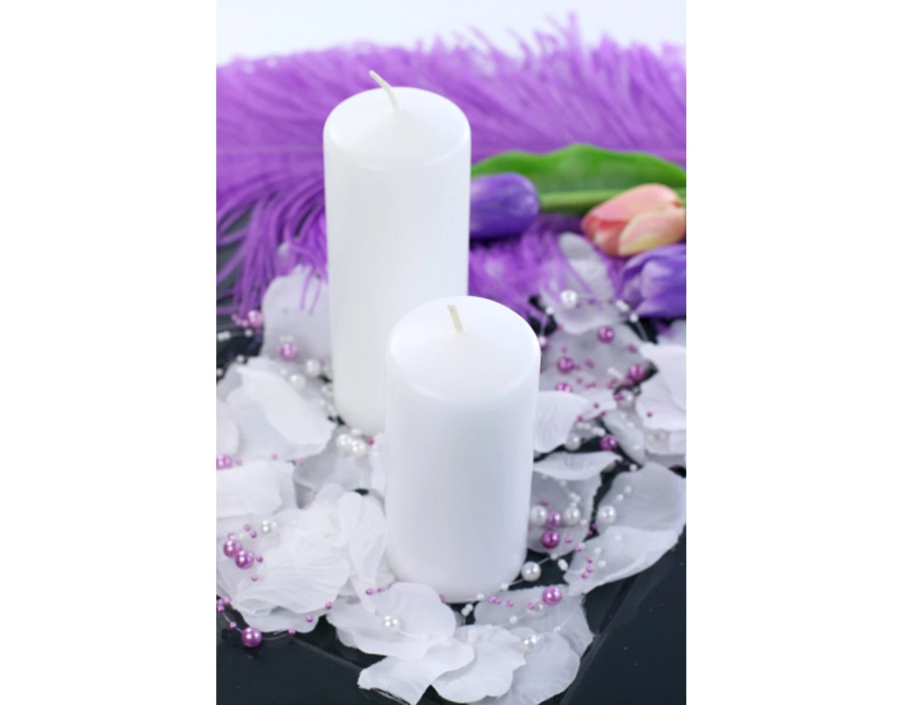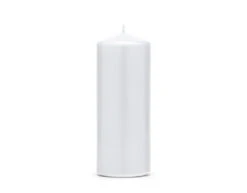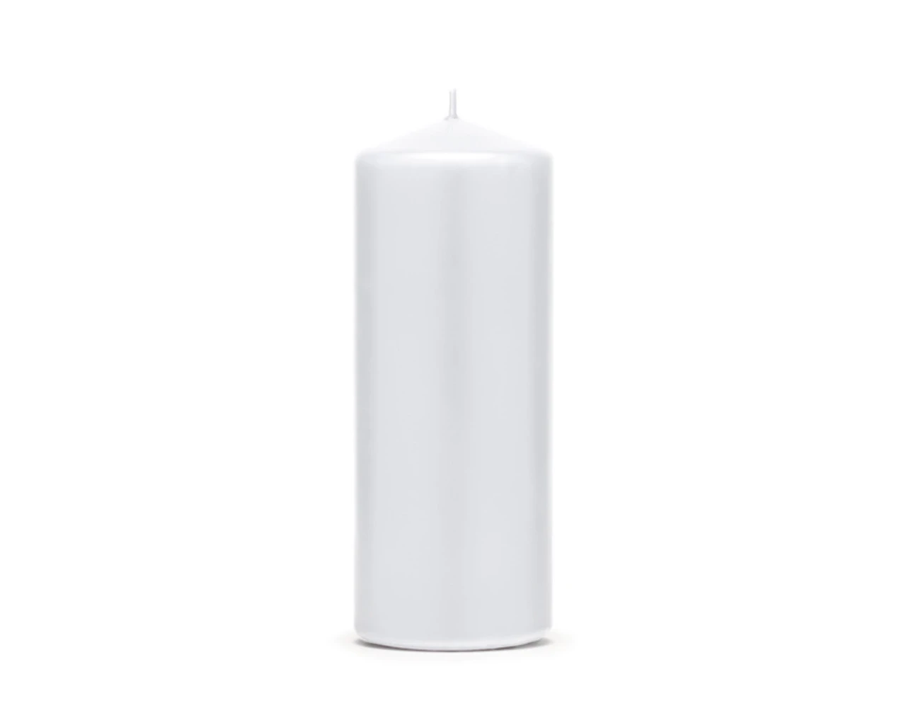 Zuilkaars, mat, wit, hoogte 15 centimeter, diameter 6 centimeter. Brandduur van 1 stuk ca. 30 uur.