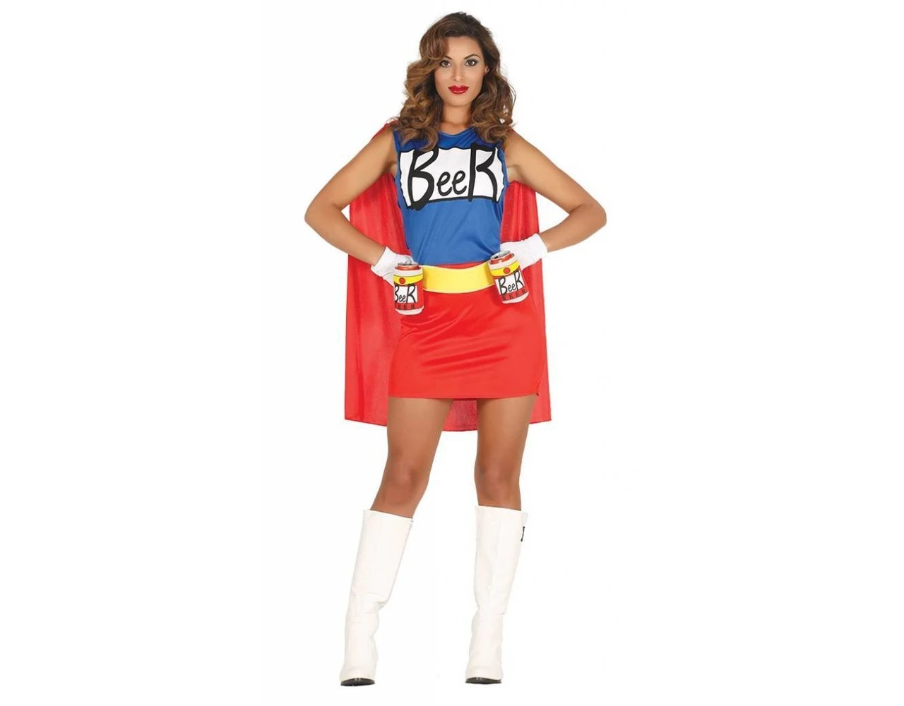 Inhoud: superheld jurk, cape en riem met bierhouders