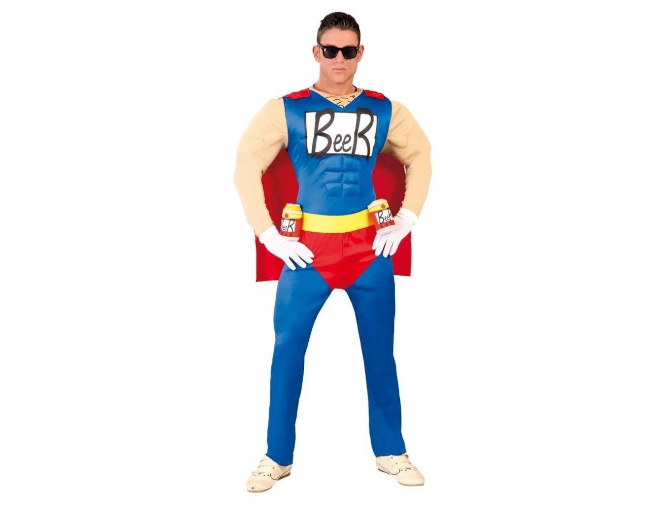 Inhoud: superheld jumpsuit met cape, riem met bierblikjes