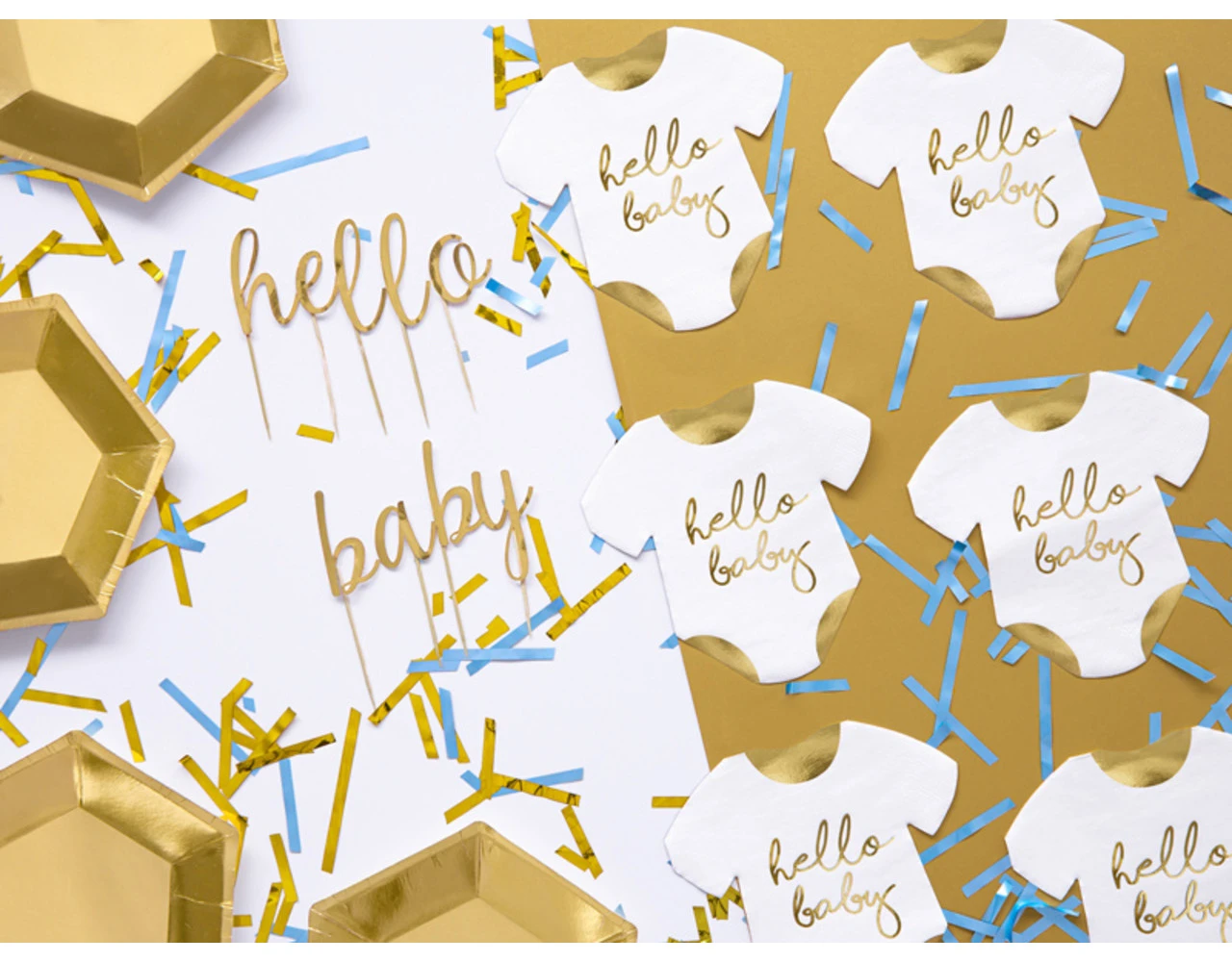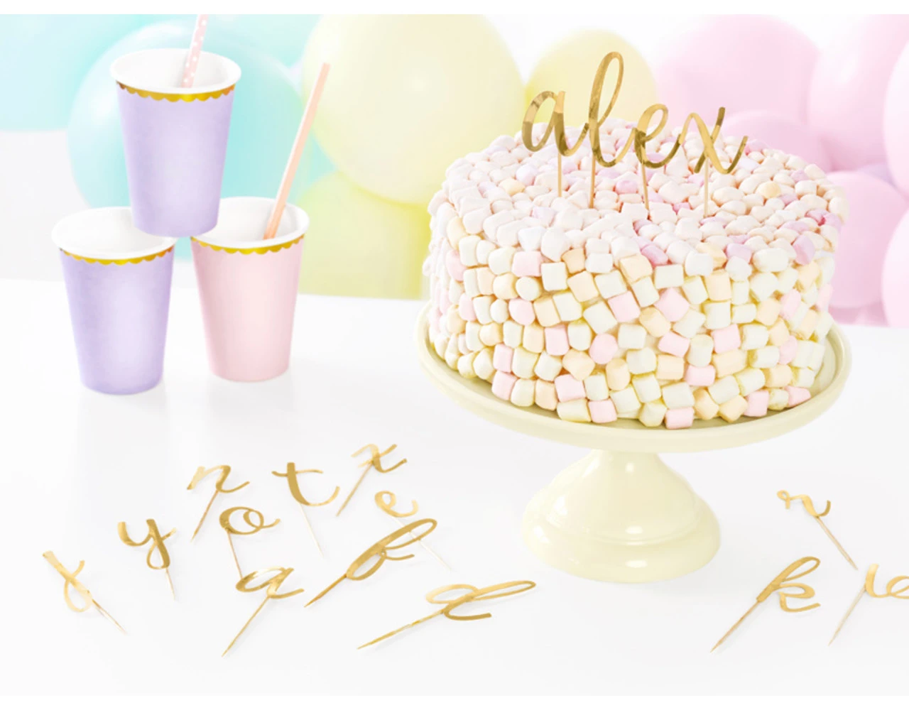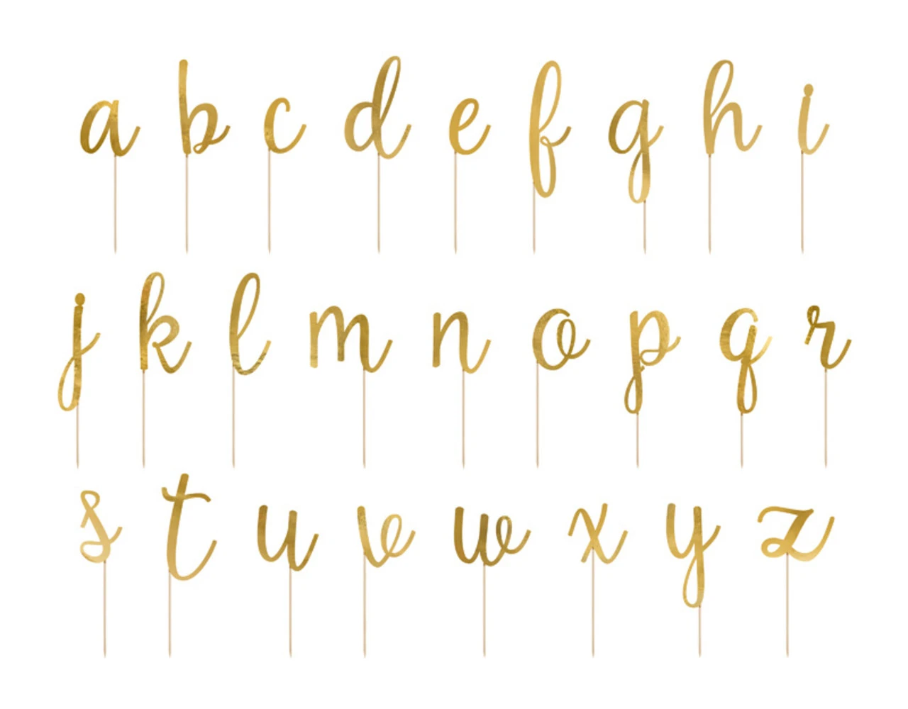 Toppers in de vorm van letters gemaakt van spiegelgoud papier op een houten stokje. Set bevat letters: A, B, C, D, E, F, G, H, I, J, K, L, M, N, O, P, Q, R, S, T, U, V, W, X, Y, Z (letter A – 3 stuks, letters van B tot Z – elk 2 stuks). Afmetingen: breedte van ca. 1,9 cm tot ca. 4 cm, hoogte van ca. 9,5 cm tot ca. 12 cm.