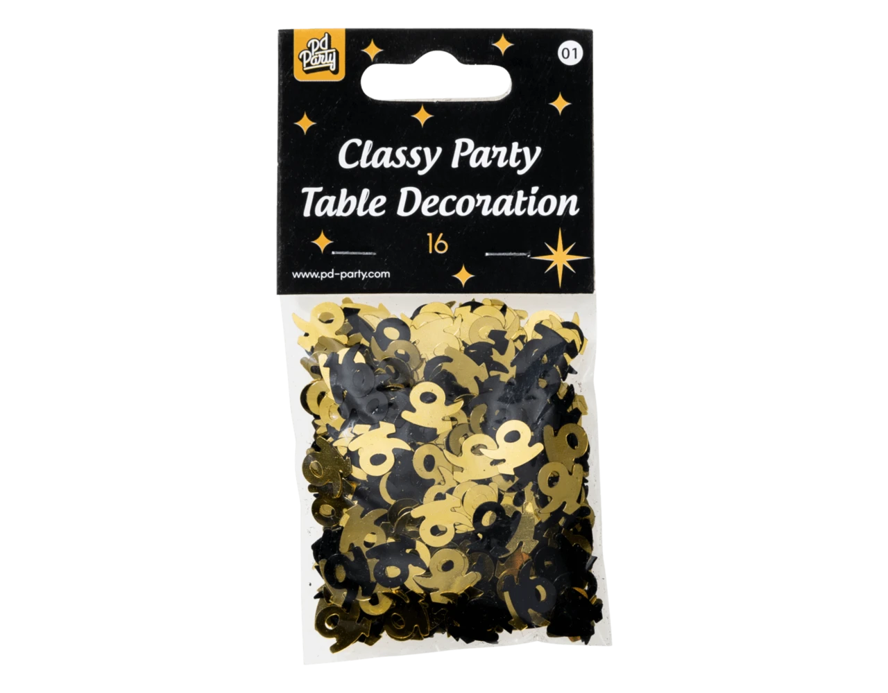 Met de Classy party table decoration is een tafel in een mum van tijd feestelijk aangekleed. Deze leuke goud zwarte feestversiering is te verkrijgen met diverse kroonleeftijden en is een leuke aanvulling op onze andere Classy party feestartikelen.