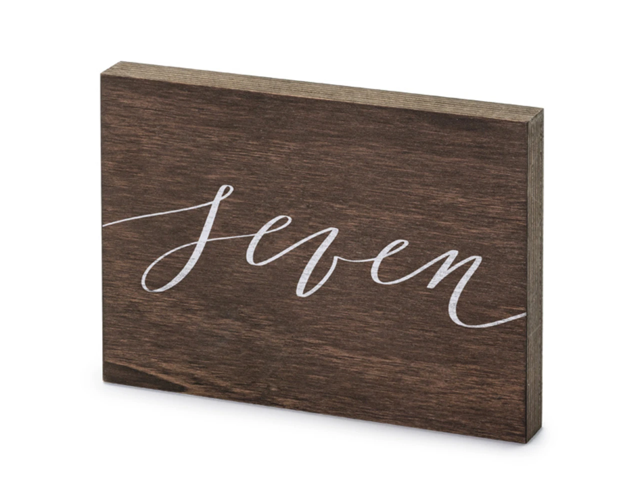 Houten tafelnummer met wit opschrift ”Seven”, afmeting ca. 2x18x12,5 cm