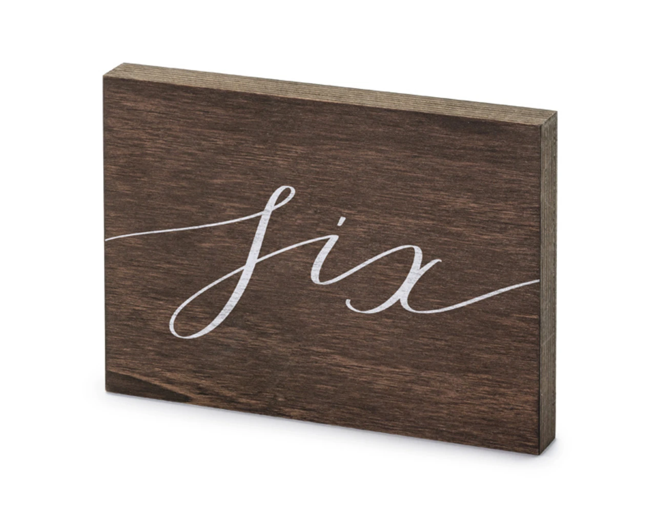 Houten tafelnummer met wit opschrift ”Six”, afmeting ca. 2x18x12,5 cm