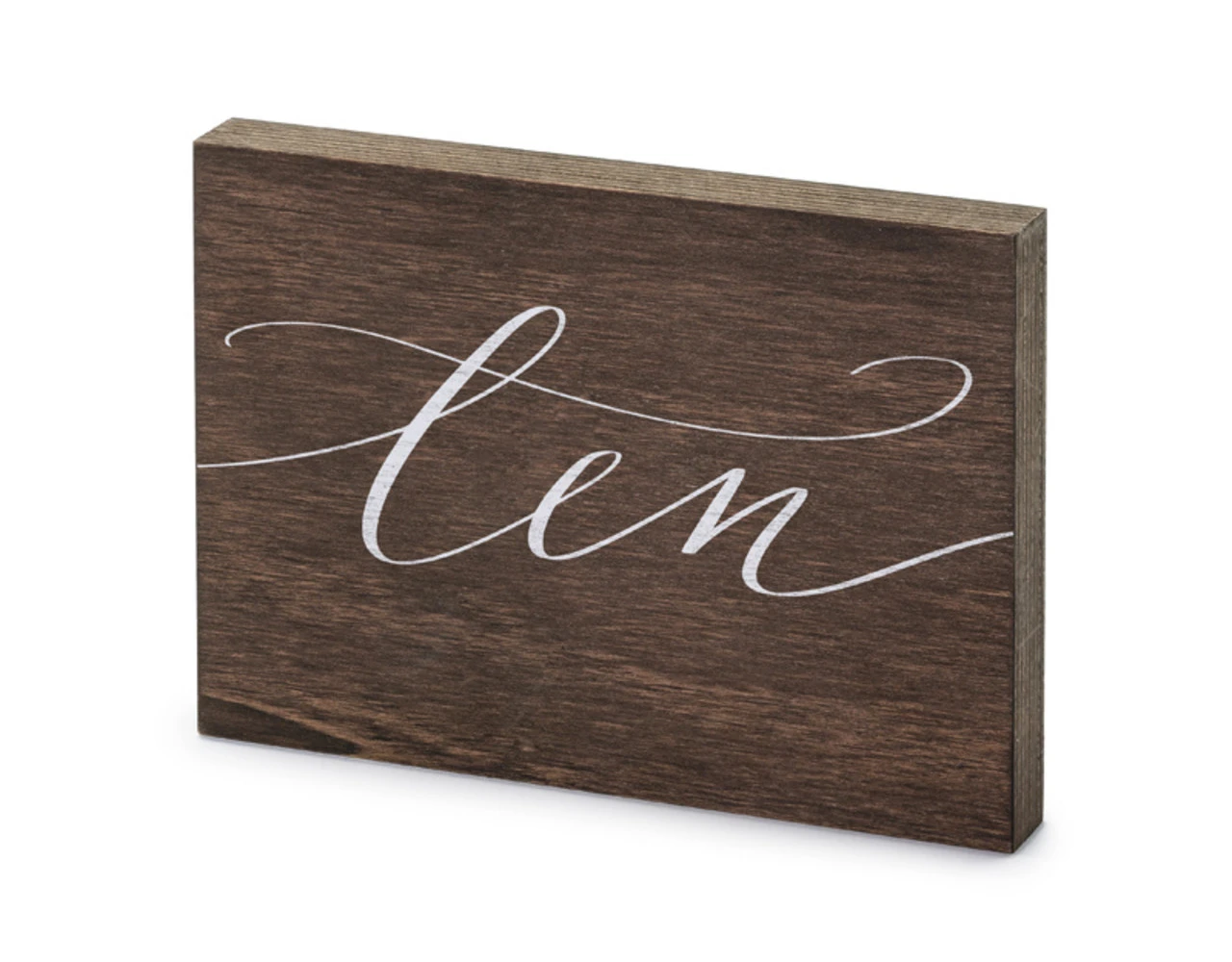 Houten tafelnummer met wit opschrift ”Ten”, afmeting ca. 2x18x12,5 cm