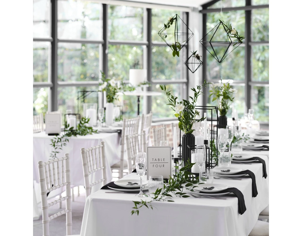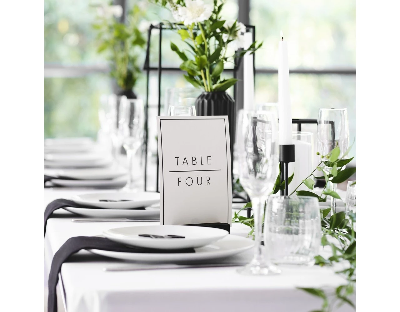 Met deze strakke tafelnummers kunnen uw gasten gemakkelijk hun tafel vinden en zien ze er prachtig uit omringd door onze bladslingers en kaarslicht.