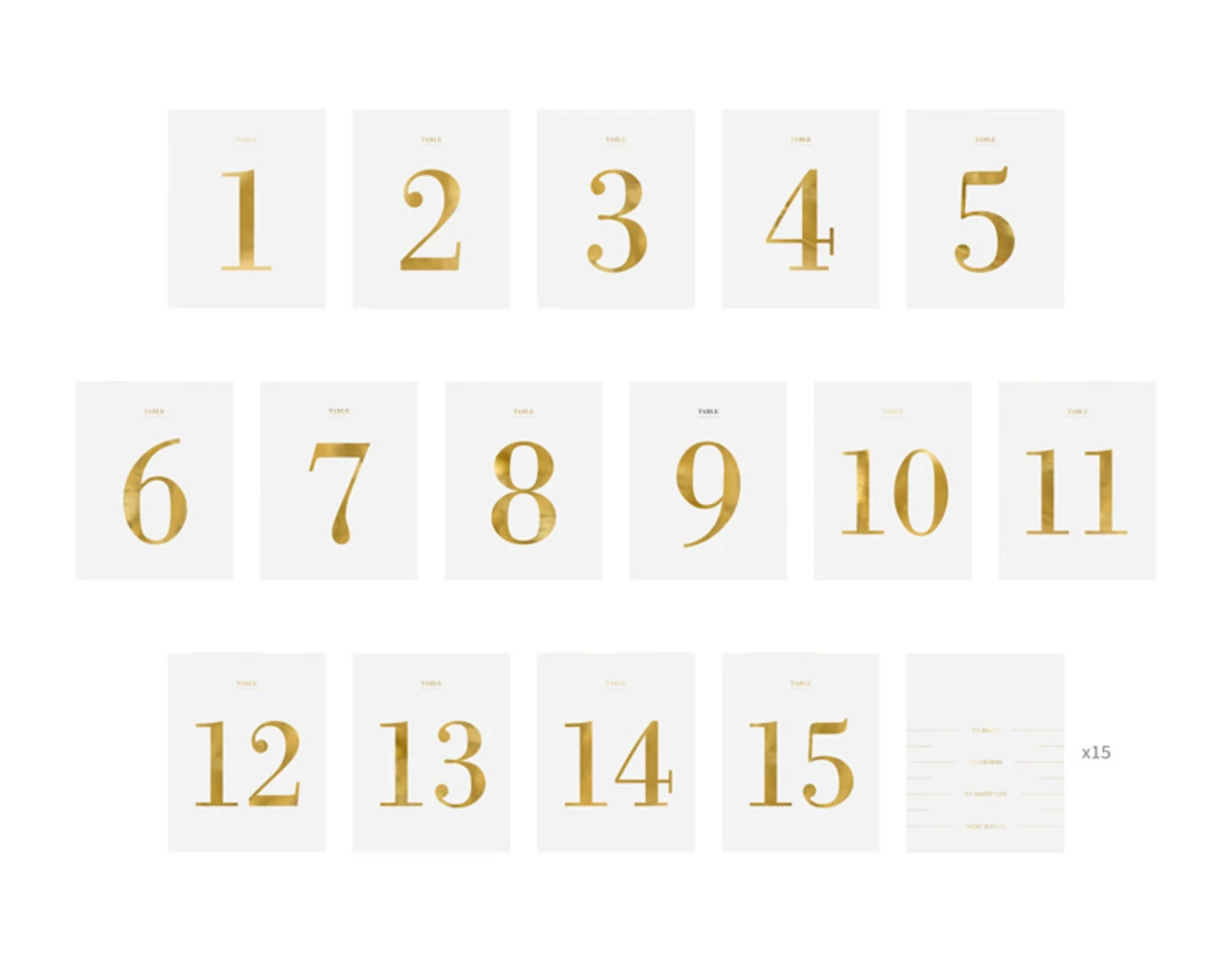 Tafelnummers in de vorm van een flesstickers, gemaakt van wit zelfklevend papier met gouden opdruk, set bevat nummers van 1 tot 15 en 15 maten, formaat ca. 9,5 x 12 cm.