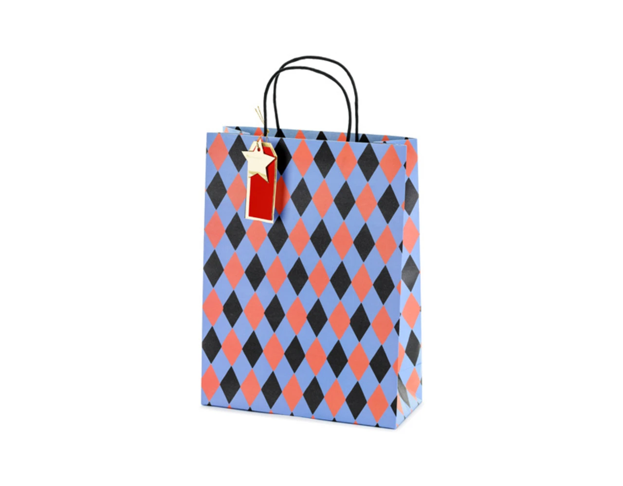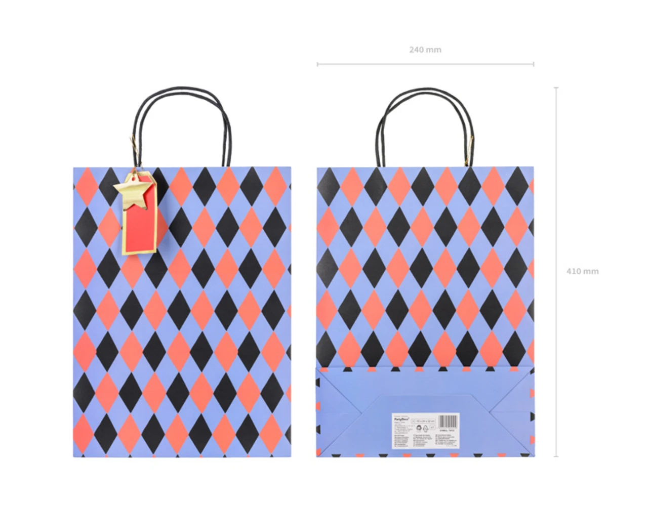 Geschenktasje Rhombuses in mix van kleuren en 2 labels, afmeting zonder hengsels ca. 10 x 24 x 32 cm.