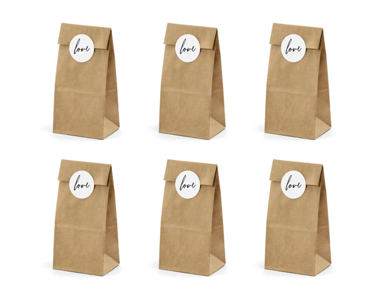 Traktatiezakjes, gemaakt van kraftpapier, met 6 witte stickers Love, afmetingen na assemblage ca. 8x18x6 cm.