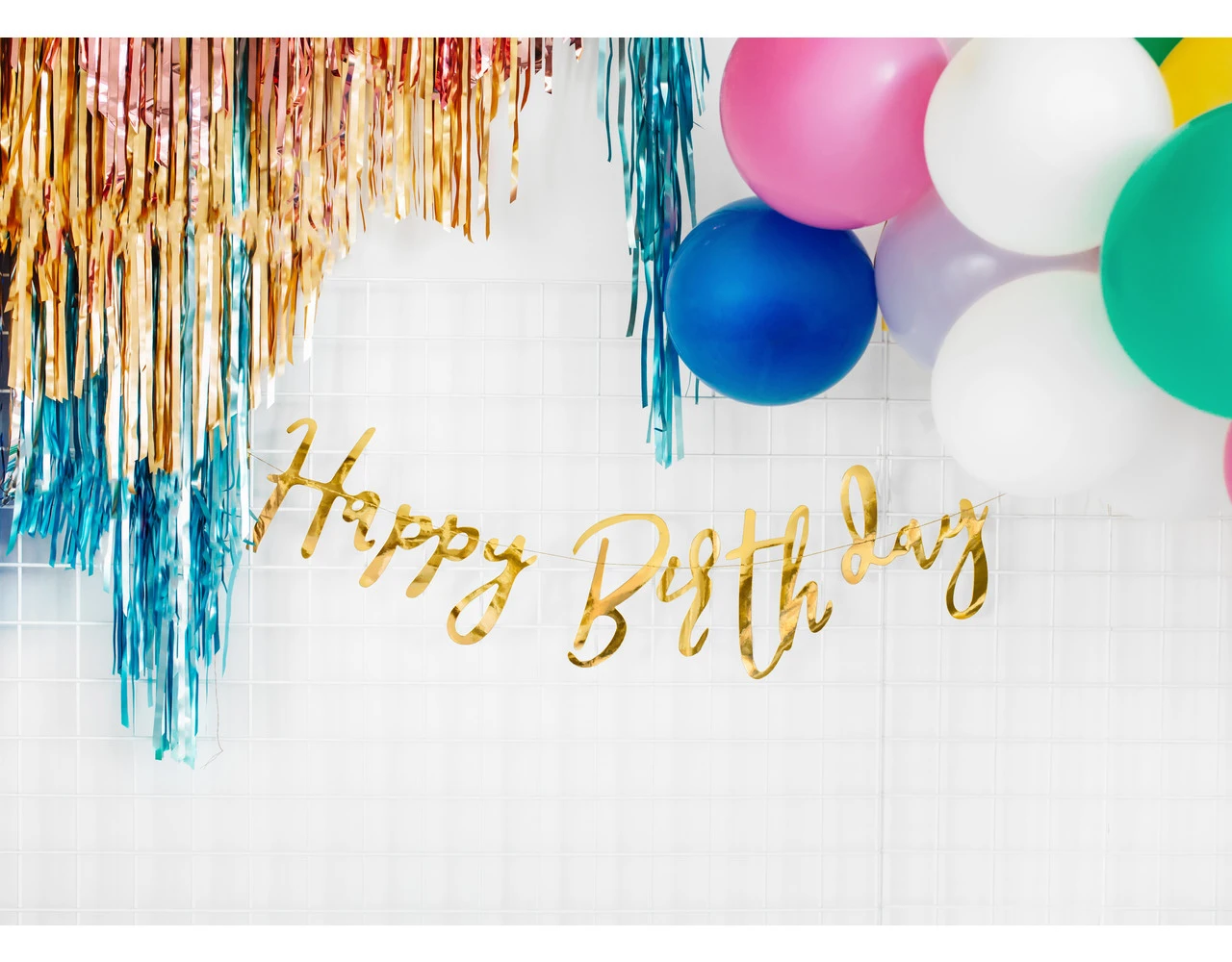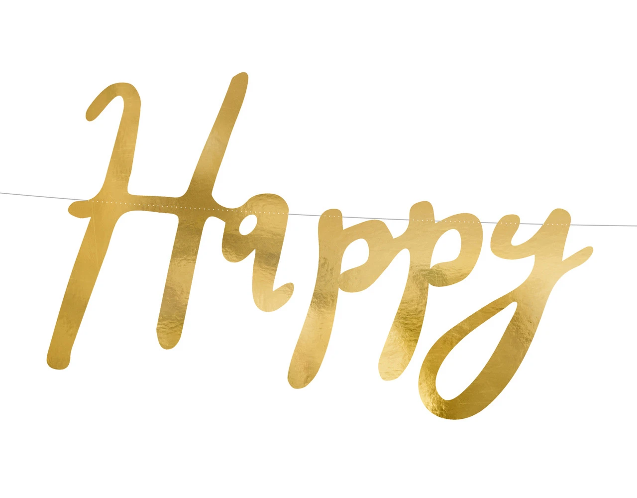 Inhoud: Genaaid banner Gelukkige Verjaardag gemaakt van spiegel goud papier, afmeting: hoogte ca. 16,5 cm, lengte ong. 62 cm.