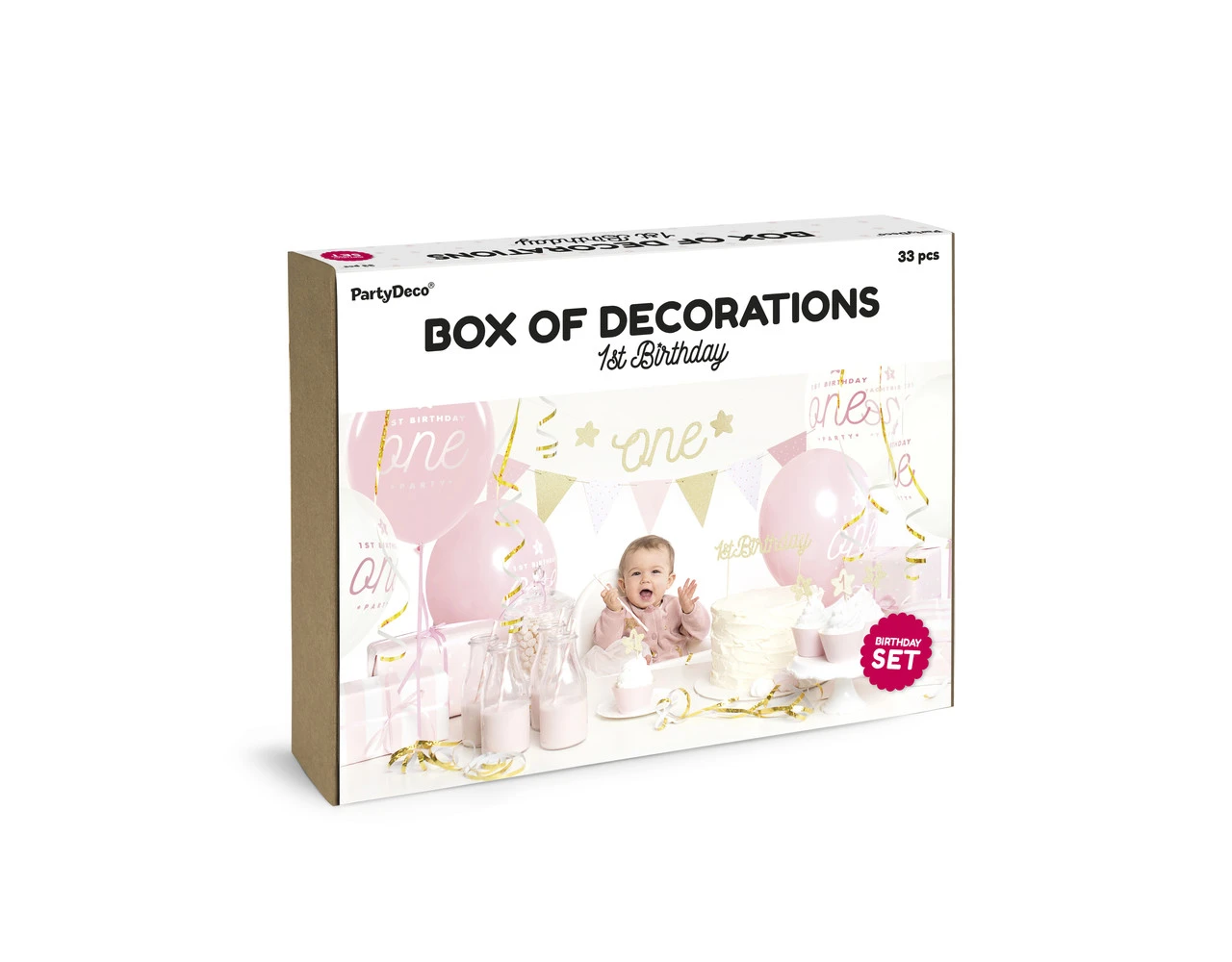 Inhoud: Party decoraties set – 1st Verjaardag, goud, set bestaat uit: banner Een (1 stuk), papier guirlande (1 stuk), cupcake toppers (6 stuks), lichtroze muffin wrappers (6 stuks), cake topper (1 stuk), rietjes (10 stuks), ballonnen (mix ontwerpen, 6 stuks), goud streamers (1 deel) en lichtroze satijnen (breedte 6 mm, 1 stuk).
