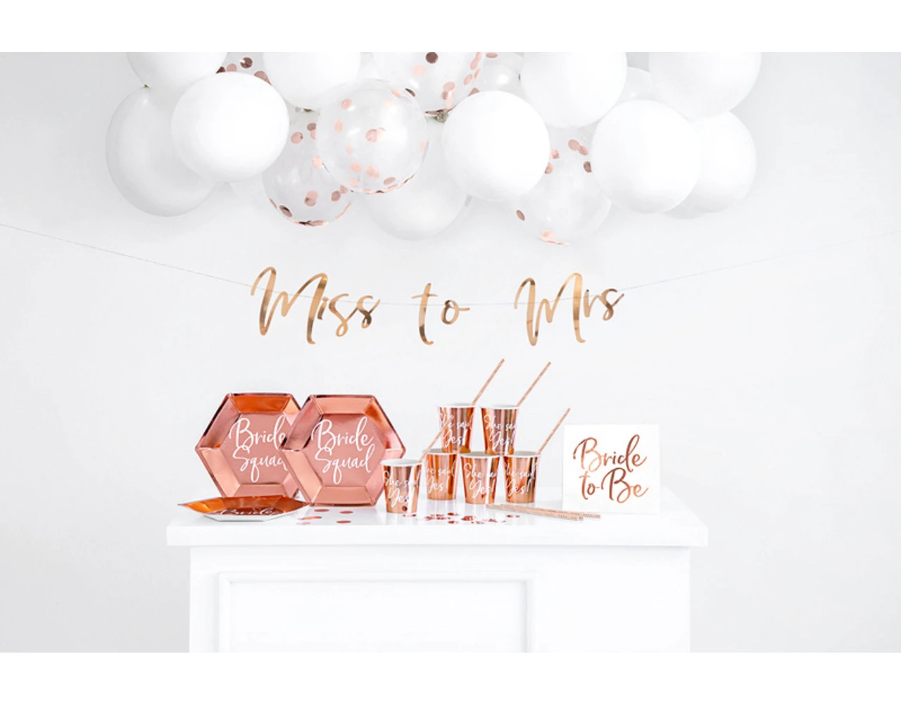 Vrijgezellenfeestdecoratieset in rosŽgoudkleur, set bevat: banner Miss to Mrs (1 stuk), papieren bekers (6 stuks), papieren borden (6 stuks), papieren rietjes (10 stuks), papieren servetten (20 stuks), confetti (15 g) en latex ballonnen (Pastel Pure White, 10 stuks en Crystal Clear, 6 stuks). Drankbekers zijn voorzien van de gedrukte markering die is voorgeschreven bij Uitvoeringsverordening (EU) 2020/2151 van de Commissie van 17 december 2020 tot vaststelling van voorschriften voor geharmoniseerde markeringsspecificaties voor eenmalige kunststofproducten die zijn opgenomen in deel D van de bijlage bij Richtlijn (EU) 2019/904 van het Europees Parlement en de Raad betreffende de vermindering van het effect van bepaalde kunststofproducten op het milieu. Het product is alleen ge‘tiketteerd in het Pools, Duits, Tsjechisch, Frans, Nederlands, Slowaaks, Sloveens en Bulgaars.