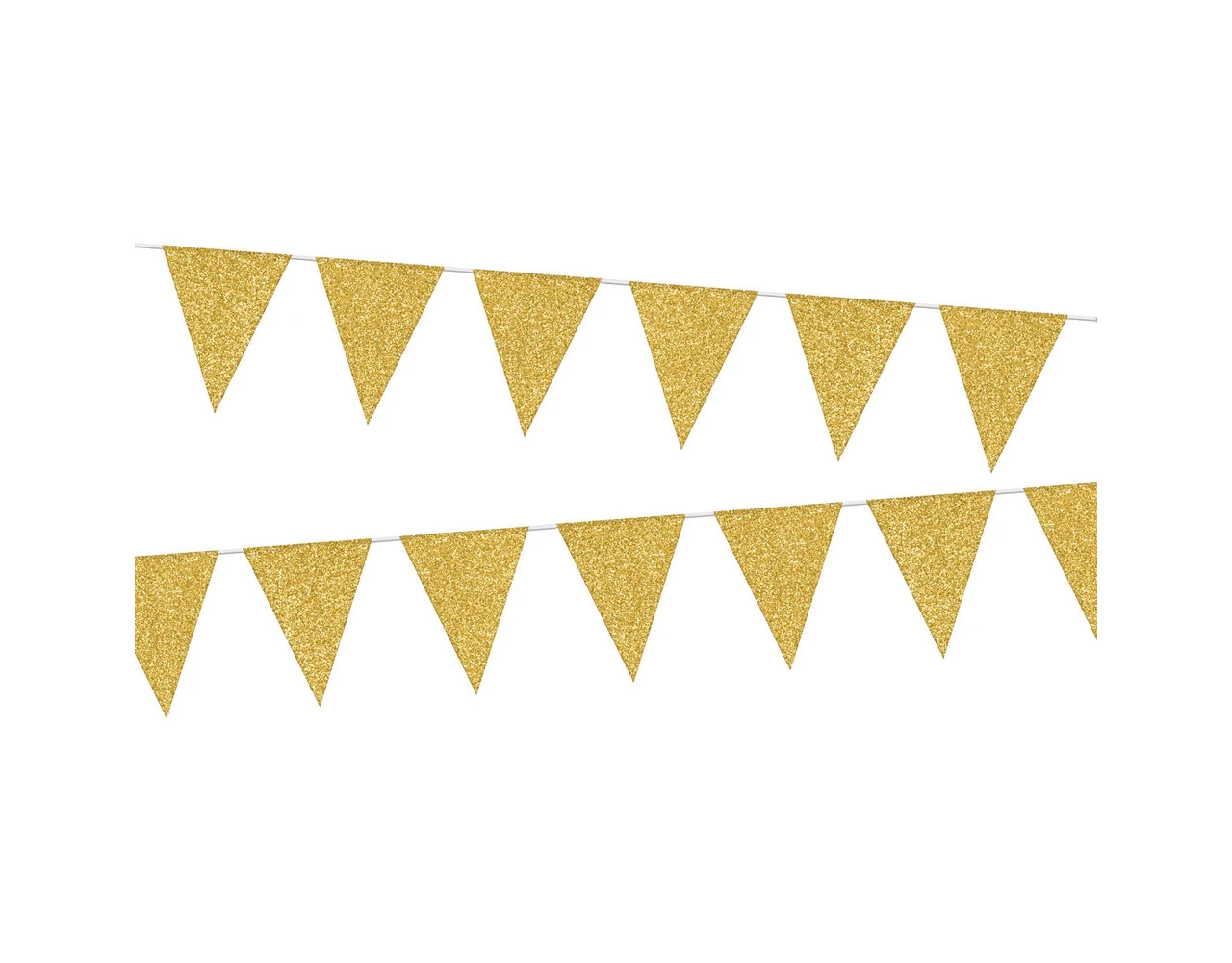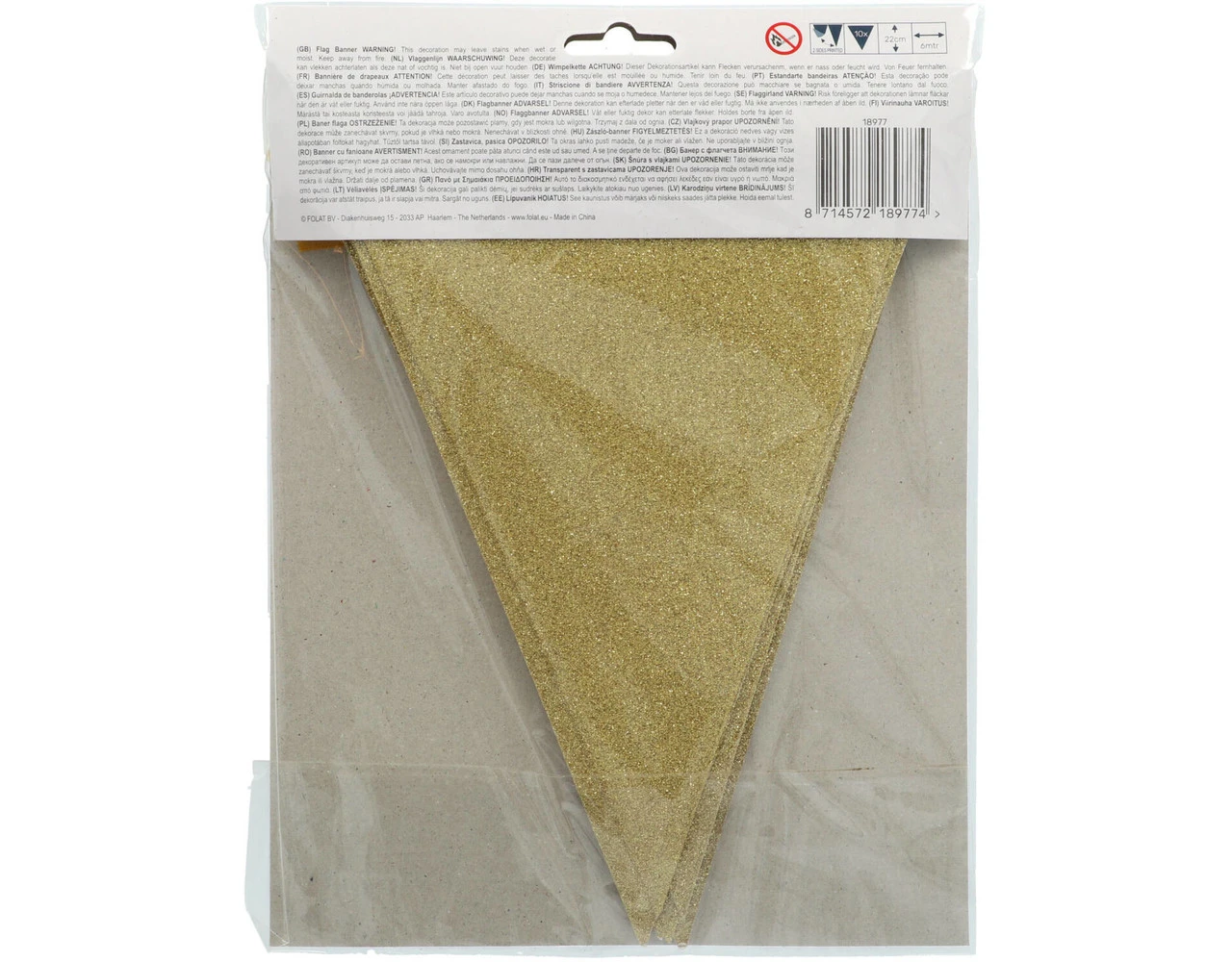 Vlaggenlijn Glamour Glitter Goudkleurig – 6 meter. Inhoud: 1 vlaggenlijn. Kleur: Goudkleurig. Bijvoorbeeld te gebruiken tijdens de volgende feestgelegenheid/feestgelegenheden: Verjaardag en Jubileum. Deze slinger is 6 meter lang met 10 vlaggetjes van 17×22 cm. Dubbelzijdig bedrukt, één kant met glitter. Het artikel is gemaakt van papier.