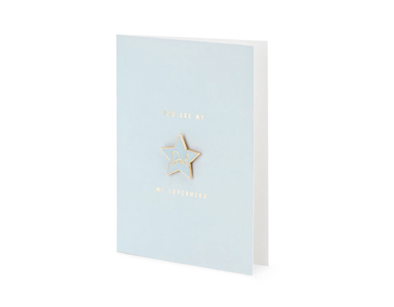Kaart in blauwe kleur met goudmetallic opdruk met ge‘mailleerde speld in de vorm van een ster met inscriptie Pa en blauwe envelop met goudmetallic opdruk, afmeting kaart ca. 10,5 x 14,8 cm, afmeting ge‘mailleerde speld ca. 3 x 3 cm.