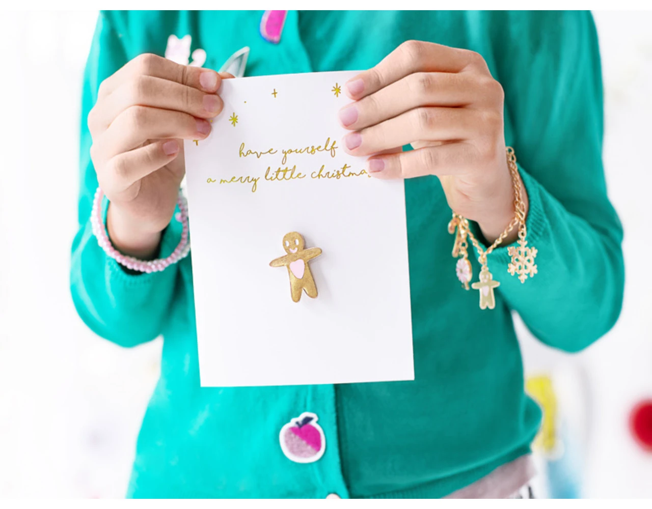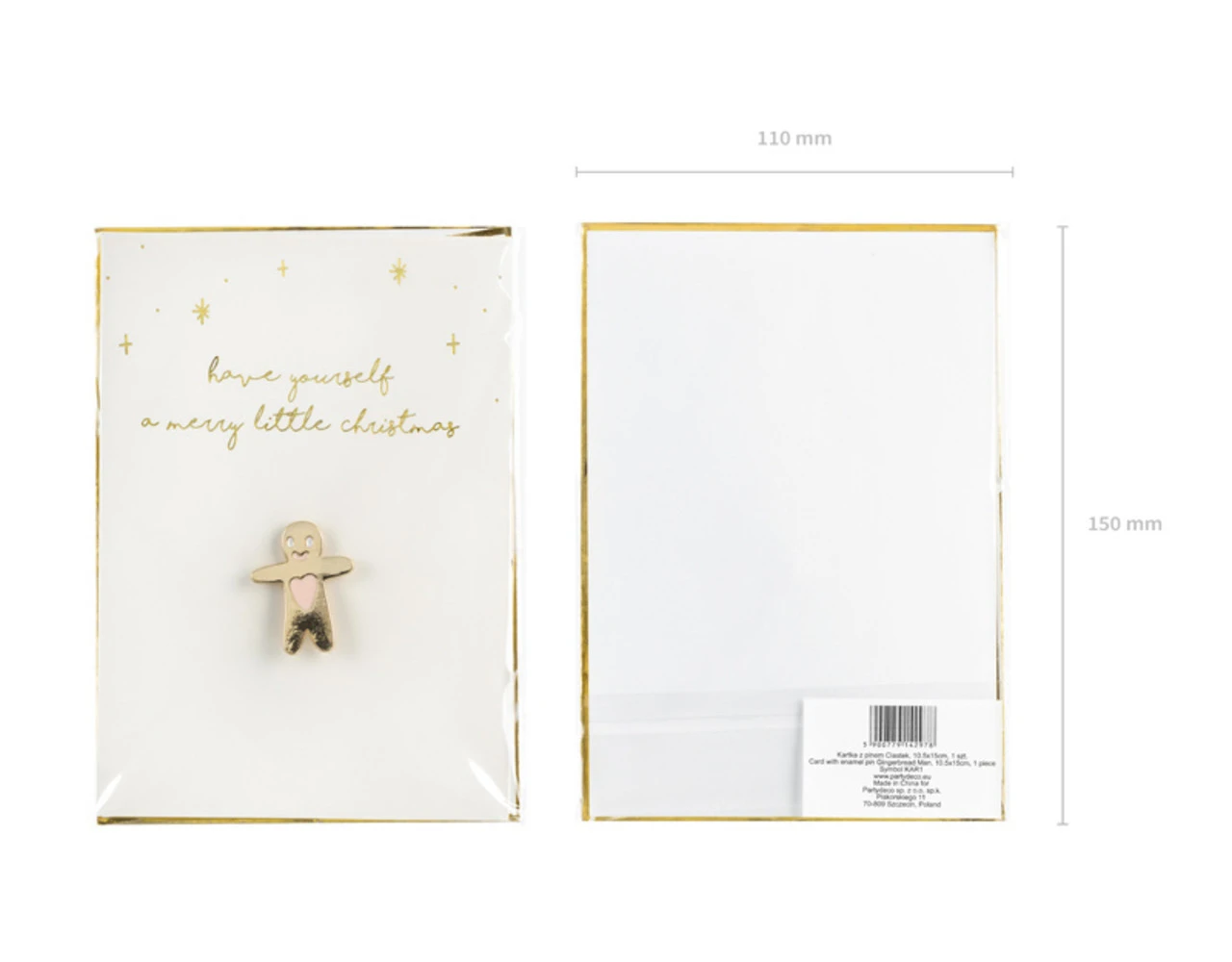 Papieren kaart in witte kleur met goud-metallic opdruk met ge‘mailleerde speld in de vorm van een Gingerbread Man en witte envelop met goud-metallic opdruk, formaat kaart ca. 10,5 x 14,8 cm, formaat ge‘mailleerde speld ca. 2,5 x 3,5 cm.