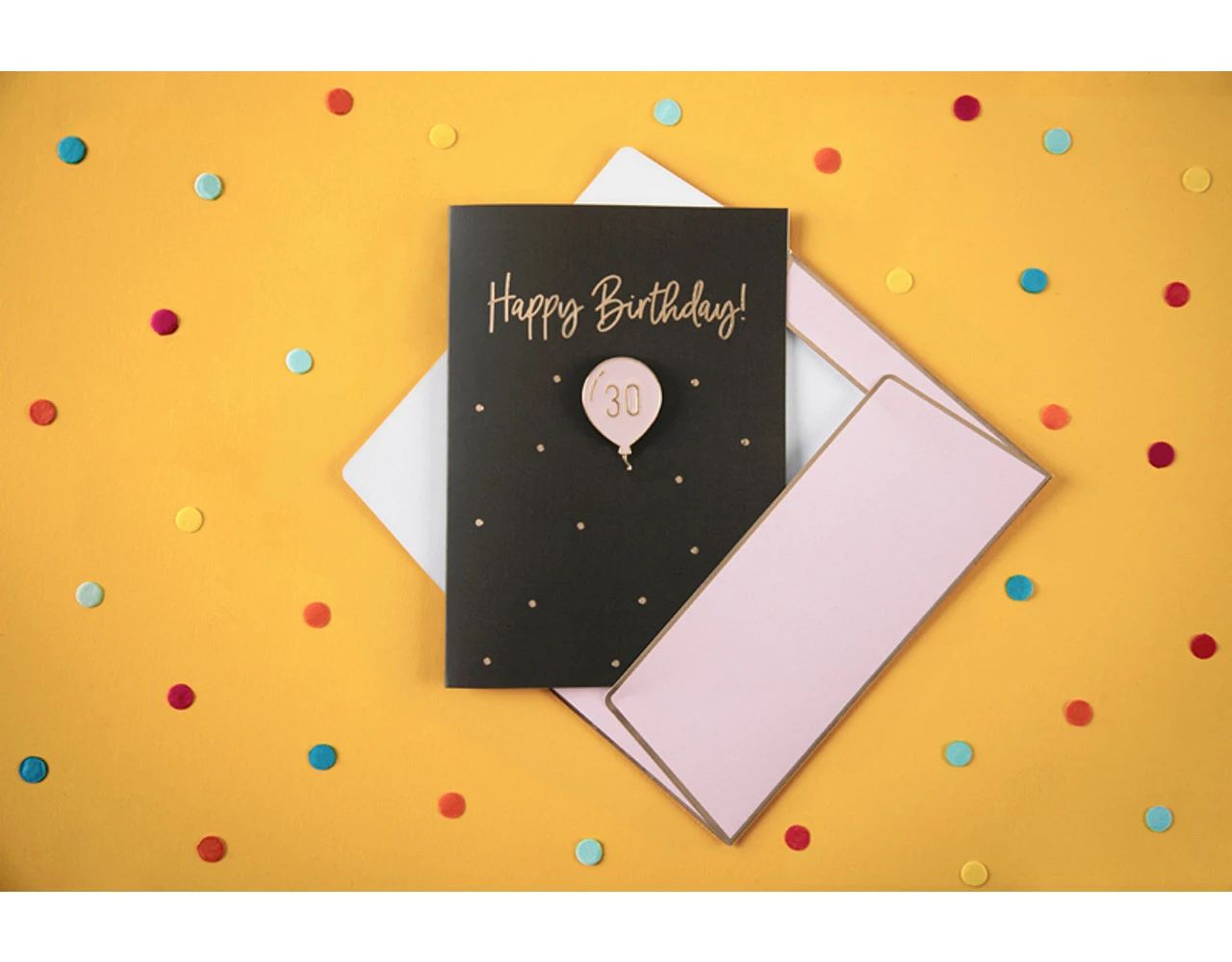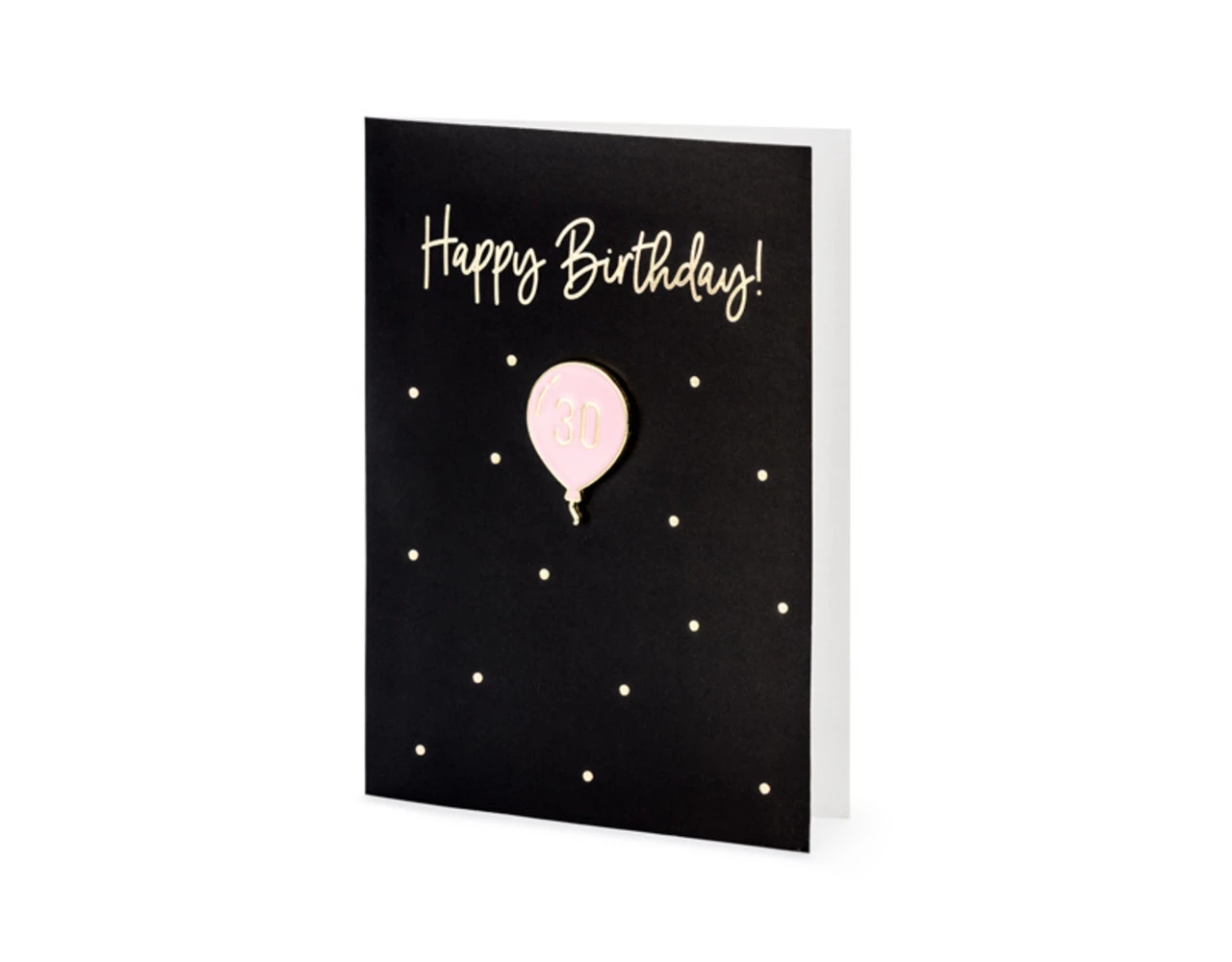 Kaart in zwarte kleur met goud-metallic opdruk met ge‘mailleerde speld in de vorm van een ballon met inscriptie 30 en roze envelop met goud-metallic opdruk, formaat kaart ca. 10,5 x 14,8 cm, formaat ge‘mailleerde speld ca. 2,5 x 3,5 cm.