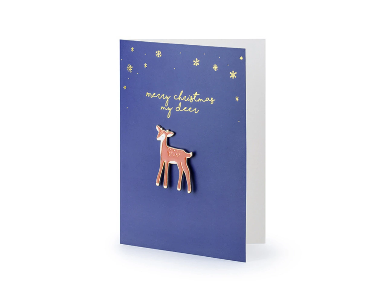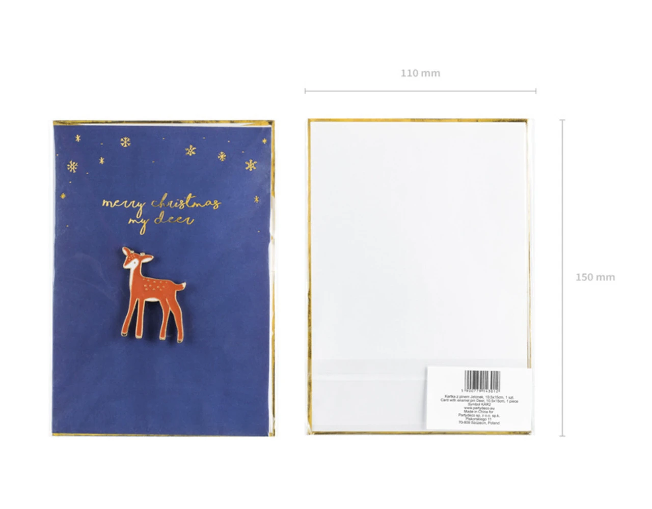 Papieren kaart in marineblauwe kleur met goudmetallic opdruk met emailspeld in de vorm van een hert en witte envelop met goudmetallic opdruk, afmeting kaart ca. 10,5 x 14,8 cm, afmeting emailspeld ca. 3 x 4,5 cm.