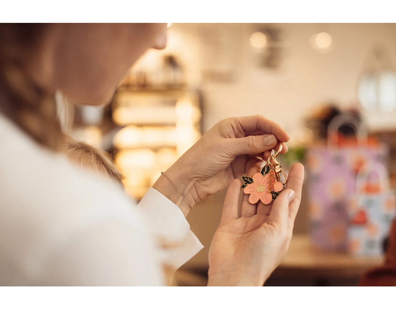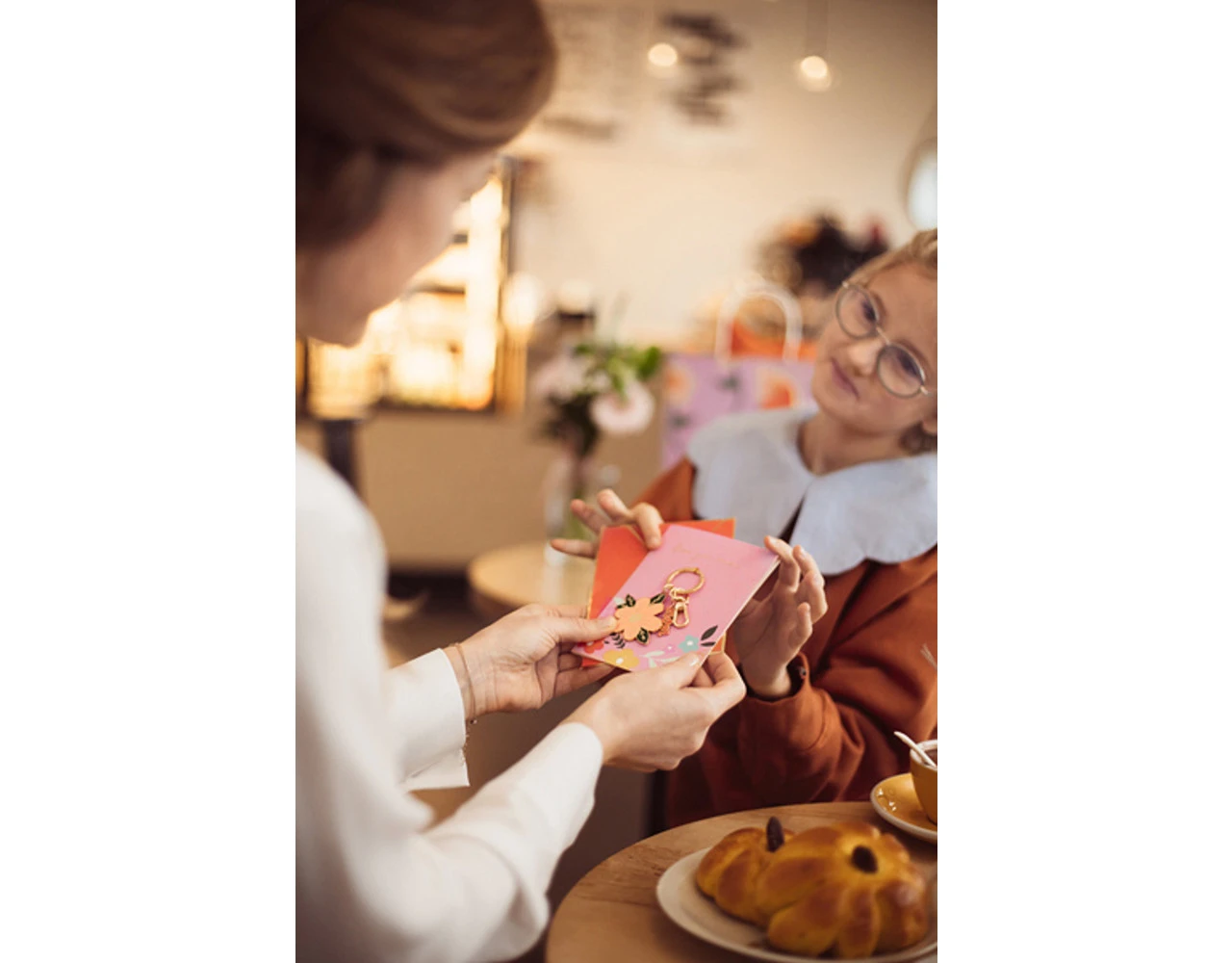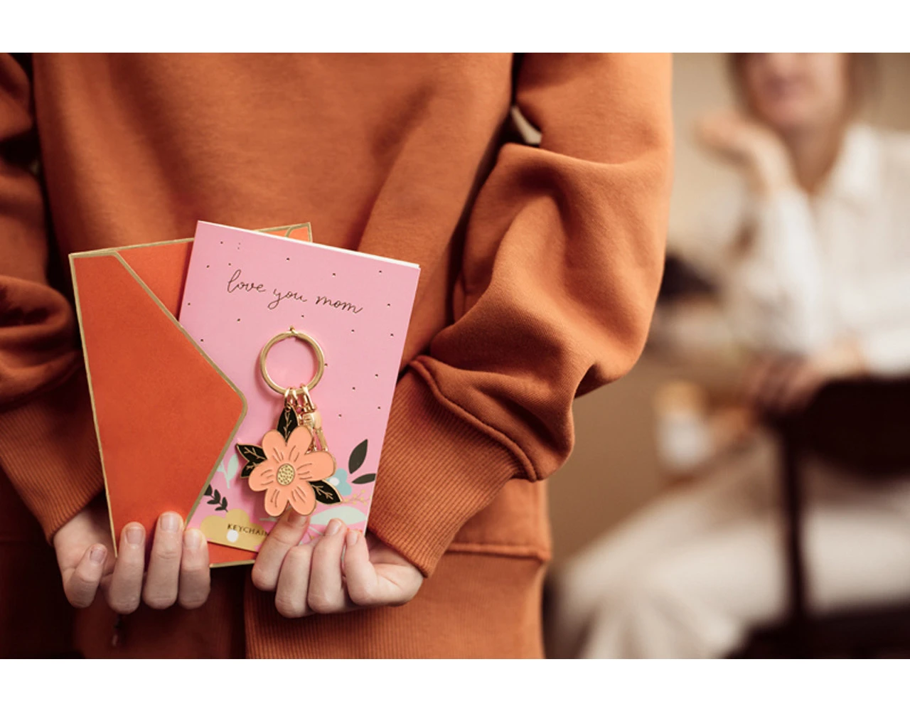 Kaart in roze kleur met opschrift ” Love you mom ”, sleutelhanger in de vorm van een bloem en rode enveloppe, afmeting enveloppe ca. 12 x 16, hoogte sleutelhanger ca. 8,5 cm.